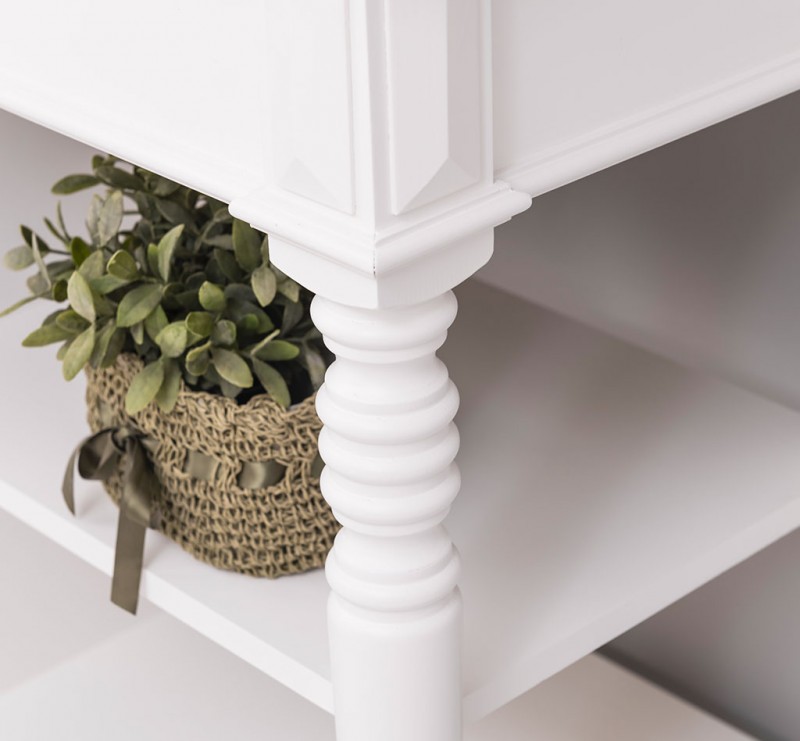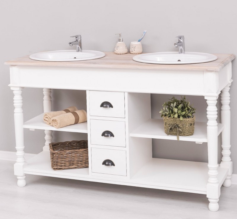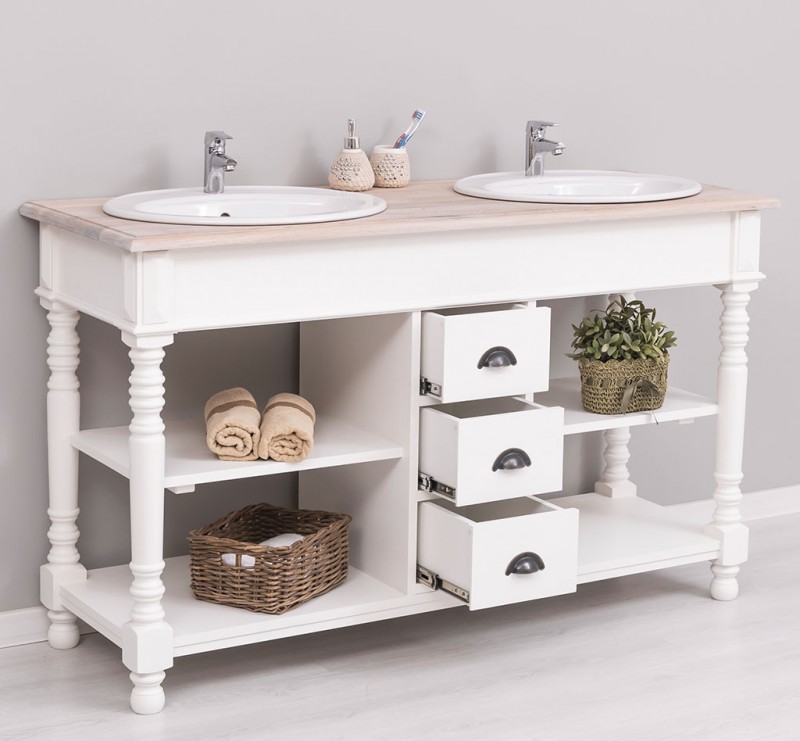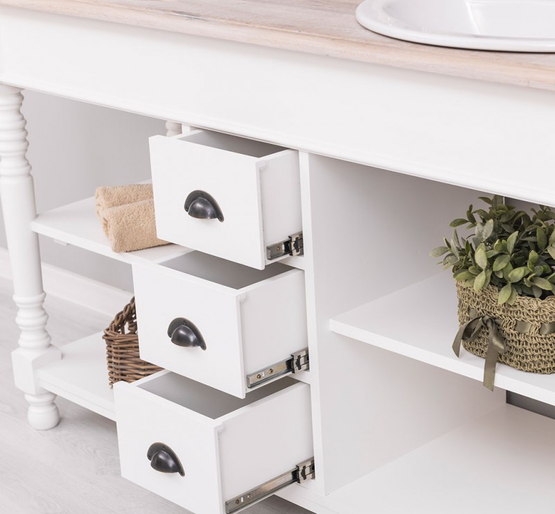 Dieses Badezimmermöbel bietet großzügigen Stauraum in offenen Fächern sowie in 3 Schubladen. Waschbecken und Wasserhähne sind nicht im Preis inbegriffen, können jedoch perfekt auf unserer Website ergänzt werden, um die Harmonie im Badezimmer zu vervollkommnen.