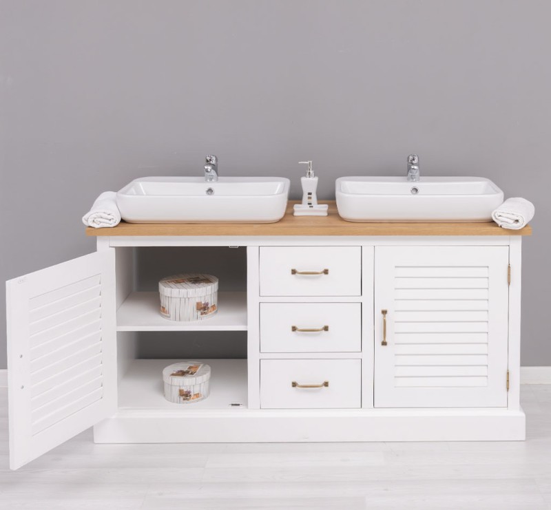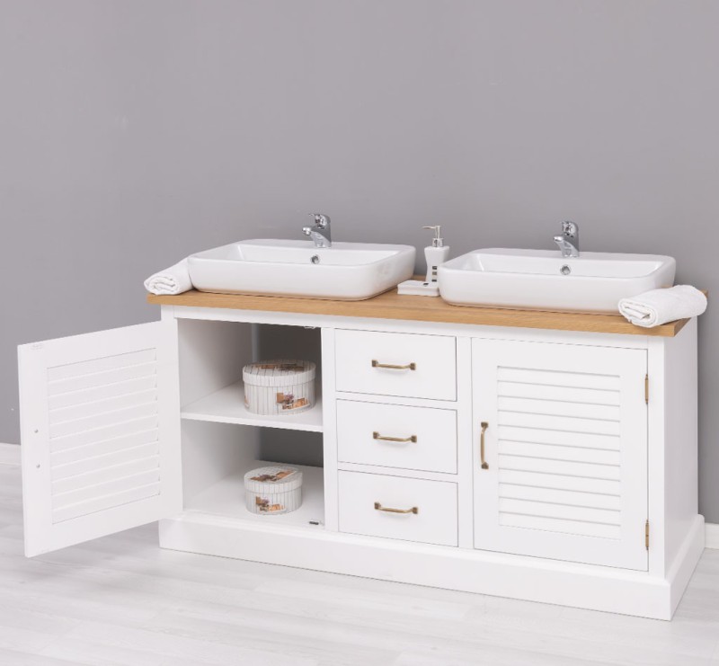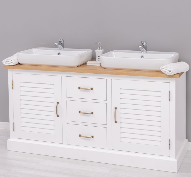 Massivholz Badezimmertisch für 2 Waschbecken mit Eichenplatte - - Badezimmer Möbel