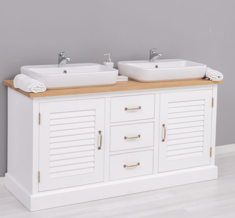 Unser Massivholz-Badezimmertisch für 2 Waschbecken mit Eichenplatte vereint Eleganz und Funktionalität auf höchstem Niveau, um Ihr Badezimmer in ein stilvolles Paradies zu verwandeln.
