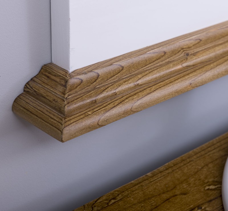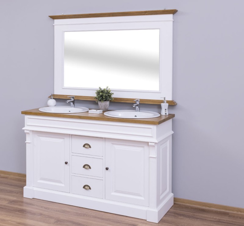 Stilvolles Massivholzdesign aus Europa Unser Badezimmerschrank für 2 Waschbecken ist ein exquisites Möbelstück für Ihr Badezimmer. Er besteht aus 100 % massivem Kiefernholz und wird in Europa hergestellt, was seine zeitlose Schönheit und Langlebigkeit garantiert. Flexible Gestaltungsmöglichkeiten Der Schrank wird in zwei Teilen geliefert und ist leicht zu montieren. Sie haben die Wahl zwischen einer Tischplatte aus massivem Kiefernholz, Eichenholz oder einer verzinkten Tischplatte für zusätzliche Stabilität. Praktischer Stauraum und Eleganz Der Schrank bietet großzügigen Stauraum hinter massiven Türen und verfügt über offene Regale im mittleren Bereich. Der obere Teil ist als praktische Ablagefläche gestaltet und enthält Spiegel. Beachten Sie, dass Waschbecken und Wasserhähne nicht im Lieferumfang enthalten sind, aber passende Optionen auf unserer Website verfügbar sind. Einfache Pflege und Wartung Die Pflege gestaltet sich unkompliziert - ein leicht feuchtes Tuch reicht aus, um Staub und Schmutz zu entfernen. Aufgrund des Massivholzmaterials empfehlen wir, den Schrank nach dem Kontakt mit Wasser mit einem trockenen Tuch abzuwischen und trocken zu halten. Abmessungen: H: 210 cm, B: 174 cm, T: 60 cm Außenfarbe - frei wählbar Innenfarbe - frei wählbar Massivholz Möbel Landhausstil 100% Kieferholz verschiedene Farben wählbar Beschläge/Griffe wählbar Oberflächen und Farben sind frei wählbar. 36 Farben und 8 Oberflächen (lackiert/gewachst/natur usw.) - Andere Abmessungen und Sonderanfertigungen sind möglich. Bitte Fragen Sie uns.