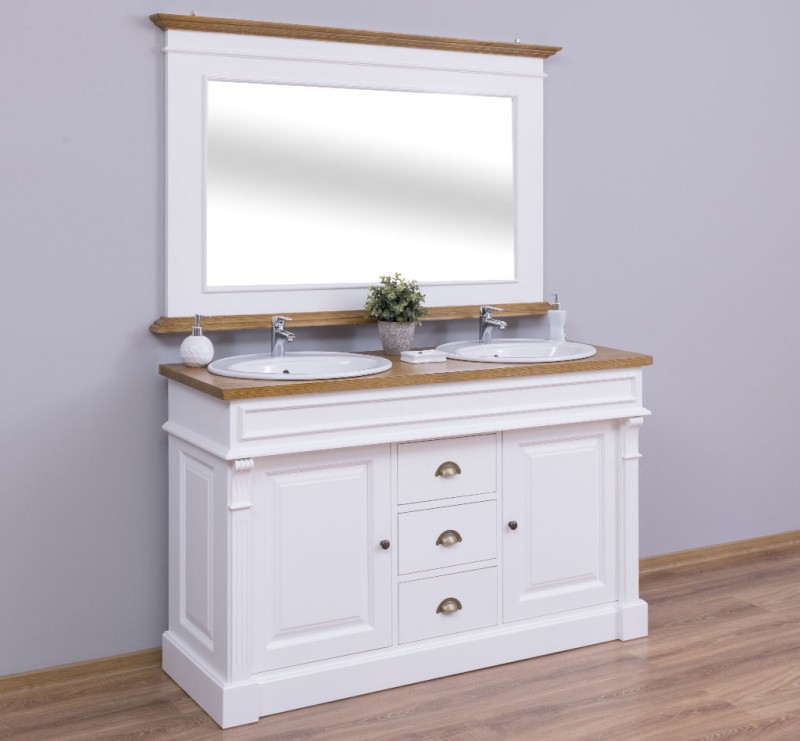 Hochwertiges Design für Ihr Badezimmer Unser Massivholz-Badezimmertisch für 2 Waschbecken mit Eichenplatte vereint Eleganz und Funktionalität auf höchstem Niveau, um Ihr Badezimmer in ein stilvolles Paradies zu verwandeln. Die Perfektion aus Vollholz Dieses außergewöhnliche Möbelstück besteht aus reinem Vollholz und bietet nicht nur beeindruckende Qualität, sondern auch eine unvergleichliche Optik, die Ihr Badezimmer aufwertet. Handgefertigt in Europa Jedes Detail dieses Badezimmertisches wurde von erfahrenen Handwerkern in Europa sorgfältig gefertigt. Die äußerst solide Konstruktion verspricht eine langanhaltende Nutzungsdauer und absolute Zuverlässigkeit. Harmonie von Funktionalität und Design Unser Badezimmertisch bietet großzügigen Stauraum für Ihre Bedürfnisse. Beachten Sie, dass Waschbecken und Wasserhähne nicht im Preis enthalten sind, jedoch auf unserer Website erhältlich sind, um die harmonische Einrichtung Ihres Badezimmers zu vervollkommnen. Entdecken Sie die vollkommene Symbiose von Qualität, Ästhetik und Funktionalität mit unserem Massivholz-Badezimmertisch. Verwandeln Sie Ihr Badezimmer in einen Ort der Exzellenz und Raffinesse. Abmessungen: H: 75 cm, B: 150 cm, T: 51 cm Außenfarbe - frei wählbar Innenfarbe - frei wählbar Massivholz Möbel Landhausstil 100% Kieferholz verschiedene Farben wählbar Beschläge/Griffe wählbar Oberflächen und Farben sind frei wählbar. 36 Farben und 8 Oberflächen (lackiert/gewachst/natur usw.) - Andere Abmessungen und Sonderanfertigungen sind möglich. Bitte Fragen Sie uns.
