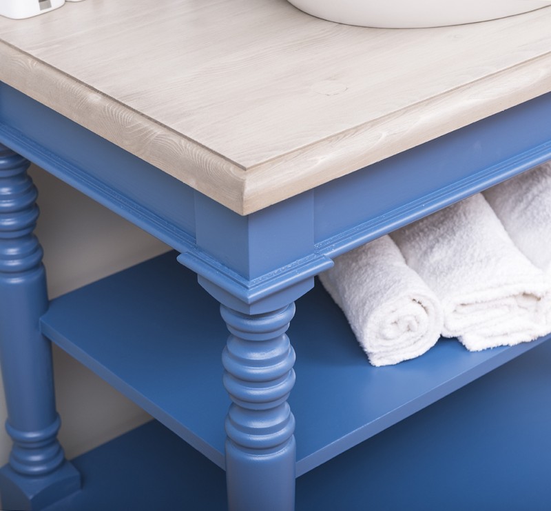 Unser Badezimmerschrank mit gedrechselten Beinen bietet klassische Eleganz und ist in verschiedenen Größen erhältlich. Wählen Sie zwischen Tischplatten aus massivem Kiefernholz, massivem Eichenholz oder verzinktem Metall.