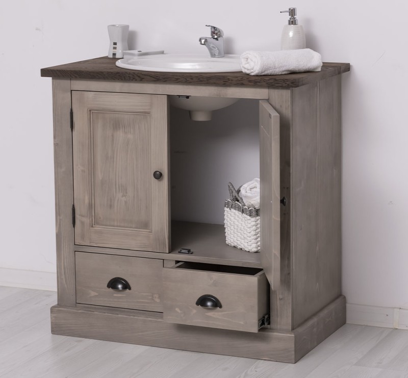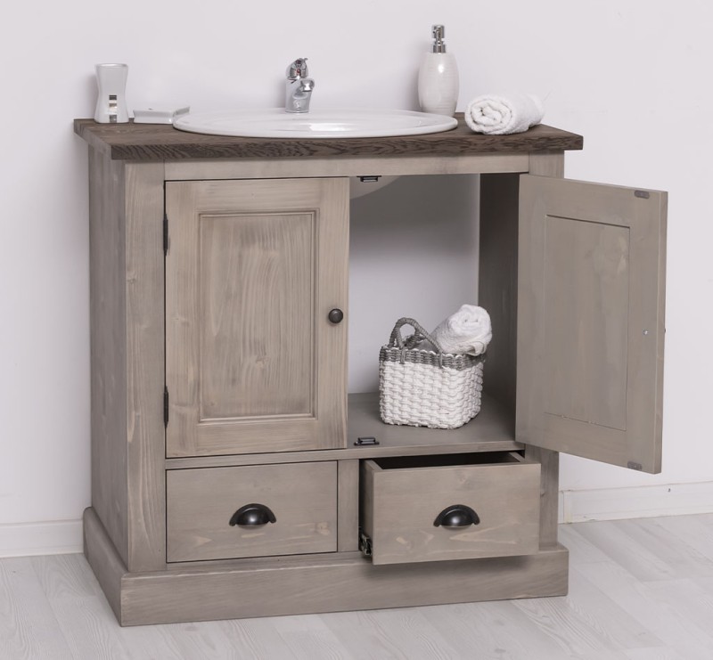 Unser Landhausstil Waschbeckenunterschrank mit zwei Türen und zwei geräumigen Schubladen ist die ideale Ergänzung für Ihr Badezimmer. Dieses Möbelstück vereint praktische Funktionalität mit einem ansprechenden Design und wird aus hochwertigem Massivholz gefertigt.