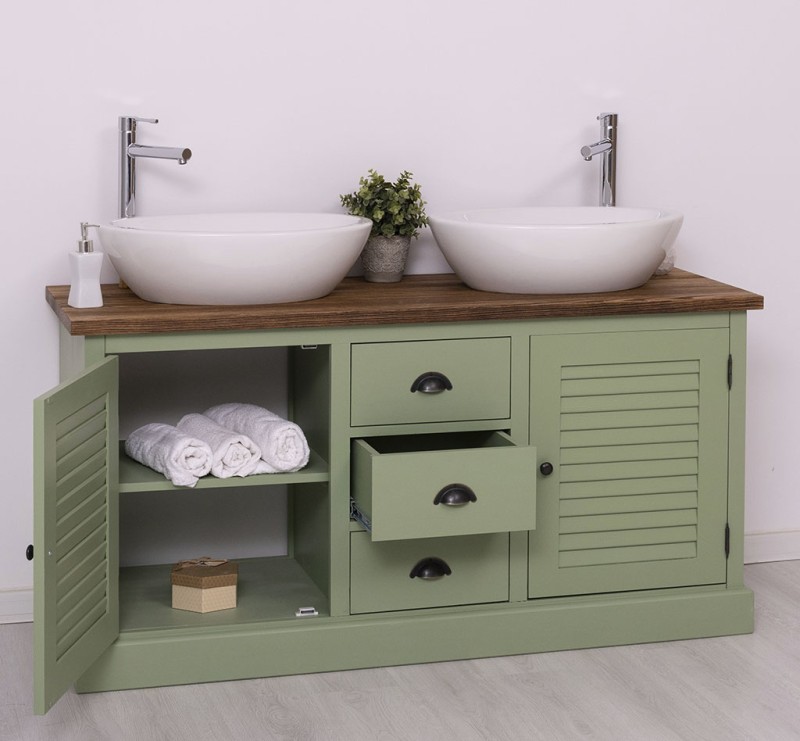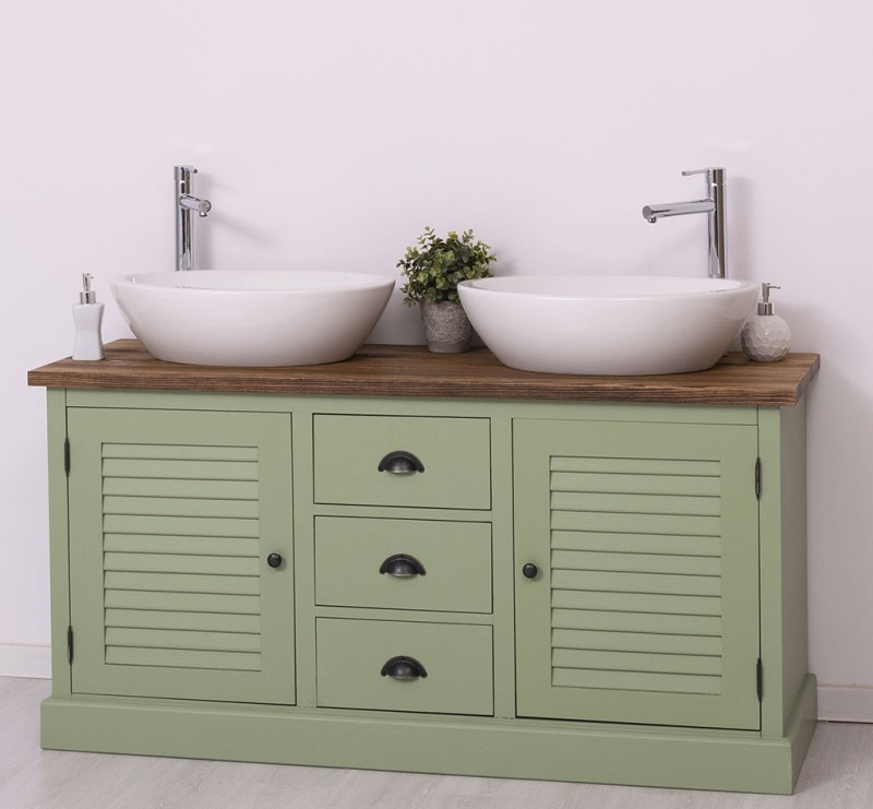 Produktbeschreibung: Unser Badezimmerschrank für 2 Waschbecken mit 3 Schubladen und elegant gedrechselten Beinen ist die perfekte Ergänzung für Ihr Badezimmer. Hergestellt in Europa aus hochwertigem 100 % massivem Kiefernholz, bietet dieses Möbelstück nicht nur eine beeindruckende Optik, sondern auch langanhaltende Qualität. Design trifft Funktionalität: Bei der Gestaltung Ihres Badezimmers sind sowohl Funktionalität als auch Design von entscheidender Bedeutung. Unsere Badmöbel mit gedrechselten Beinen verleihen Ihrem Badezimmer eine zusätzliche Portion Eleganz. Vielfältige Optionen: Wählen Sie zwischen einer Tischplatte aus massivem Kiefernholz, massivem Eichenholz oder einer verzinkten Tischplatte, um die Oberfläche noch widerstandsfähiger zu gestalten. Bitte beachten Sie, dass Waschbecken und Wasserhähne nicht im Preis enthalten sind, aber Sie können diese passend auf unserer Website in den Kategorien "Wasserhähne" und "Produkte" finden, um die perfekte Harmonie zu schaffen. Großzügiger Stauraum: Unser Badezimmerschrank bietet großzügigen Stauraum in offenen Regalen sowie durch die 3 Schubladen. Pflegehinweise: Die Reinigung ist mühelos - verwenden Sie einfach ein leicht feuchtes Tuch, um Staub und Schmutz zu entfernen. Aufgrund der spezifischen Eigenschaften von Massivholz empfehlen wir, den Schrank nach Kontakt mit Wasser mit einem trockenen Tuch abzuwischen und trocken zu halten. Verleihen Sie Ihrem Badezimmer mit unserem hochwertigen Badezimmerschrank einen Hauch von Eleganz und Funktionalität. Bestellen Sie jetzt und verwandeln Sie Ihr Badezimmer in einen Ort der Exzellenz und Raffinesse! Abmessungen: H: 90 cm, B: 150 cm, T: 54 cm Außenfarbe - frei wählbar Innenfarbe - frei wählbar Massivholz Möbel Landhausstil Tischplatte 100% Kiefernholz Korpus 100% Kieferholz verschiedene Farben wählbar Beschläge/Griffe wählbar Oberflächen und Farben sind frei wählbar. 36 Farben und 8 Oberflächen (lackiert/gewachst/natur usw.) - Andere Abmessungen und Sonderanfertigungen sind möglich. Bitte Fragen Sie uns.