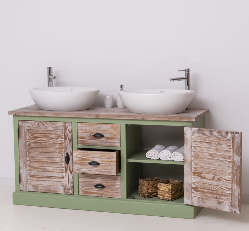 Produktbeschreibung: Unser Badezimmerschrank für 2 Waschbecken mit 3 Schubladen und elegant gedrechselten Beinen ist die perfekte Ergänzung für Ihr Badezimmer. Hergestellt in Europa aus hochwertigem 100 % massivem Kiefernholz, bietet dieses Möbelstück nicht nur eine beeindruckende Optik, sondern auch langanhaltende Qualität. Design trifft Funktionalität: Bei der Gestaltung Ihres Badezimmers sind sowohl Funktionalität als auch Design von entscheidender Bedeutung. Unsere Badmöbel mit gedrechselten Beinen verleihen Ihrem Badezimmer eine zusätzliche Portion Eleganz. Vielfältige Optionen: Wählen Sie zwischen einer Tischplatte aus massivem Kiefernholz, massivem Eichenholz oder einer verzinkten Tischplatte, um die Oberfläche noch widerstandsfähiger zu gestalten. Bitte beachten Sie, dass Waschbecken und Wasserhähne nicht im Preis enthalten sind, aber Sie können diese passend auf unserer Website in den Kategorien "Wasserhähne" und "Produkte" finden, um die perfekte Harmonie zu schaffen. Großzügiger Stauraum: Unser Badezimmerschrank bietet großzügigen Stauraum in offenen Regalen sowie durch die 3 Schubladen. Pflegehinweise: Die Reinigung ist mühelos - verwenden Sie einfach ein leicht feuchtes Tuch, um Staub und Schmutz zu entfernen. Aufgrund der spezifischen Eigenschaften von Massivholz empfehlen wir, den Schrank nach Kontakt mit Wasser mit einem trockenen Tuch abzuwischen und trocken zu halten. Verleihen Sie Ihrem Badezimmer mit unserem hochwertigen Badezimmerschrank einen Hauch von Eleganz und Funktionalität. Bestellen Sie jetzt und verwandeln Sie Ihr Badezimmer in einen Ort der Exzellenz und Raffinesse! Abmessungen: H: 90 cm, B: 150 cm, T: 54 cm Außenfarbe - frei wählbar Innenfarbe - frei wählbar Massivholz Möbel Landhausstil Tischplatte 100% Kiefernholz Korpus 100% Kieferholz verschiedene Farben wählbar Beschläge/Griffe wählbar Oberflächen und Farben sind frei wählbar. 36 Farben und 8 Oberflächen (lackiert/gewachst/natur usw.) - Andere Abmessungen und Sonderanfertigungen sind möglich. Bitte Fragen Sie uns.
