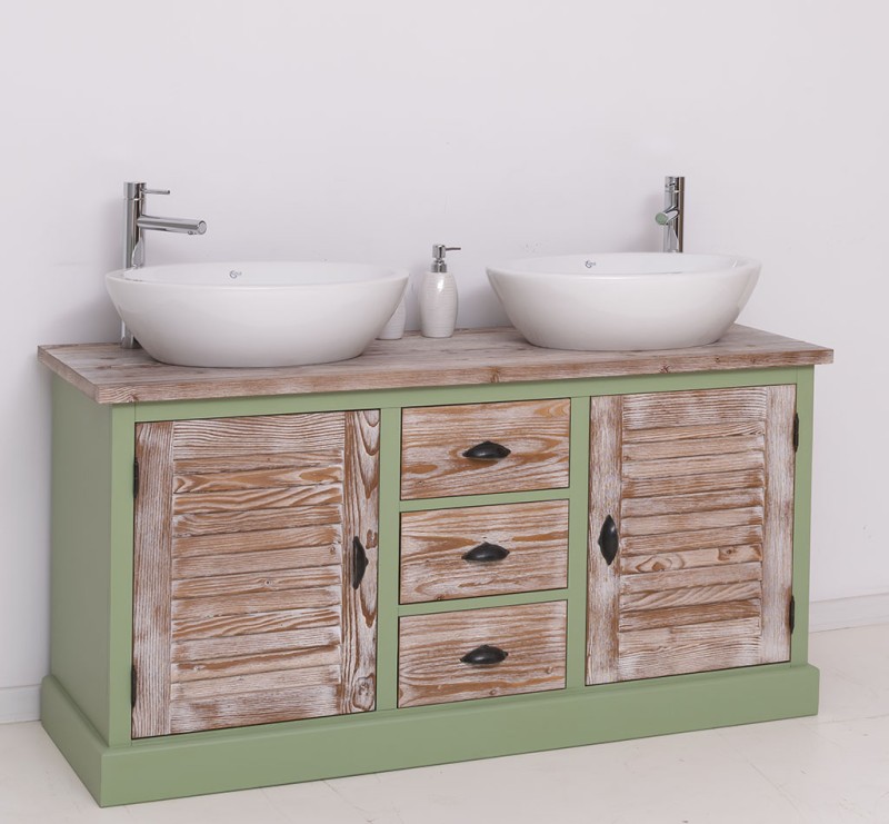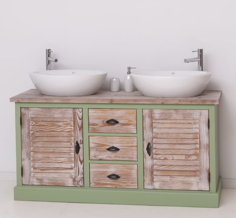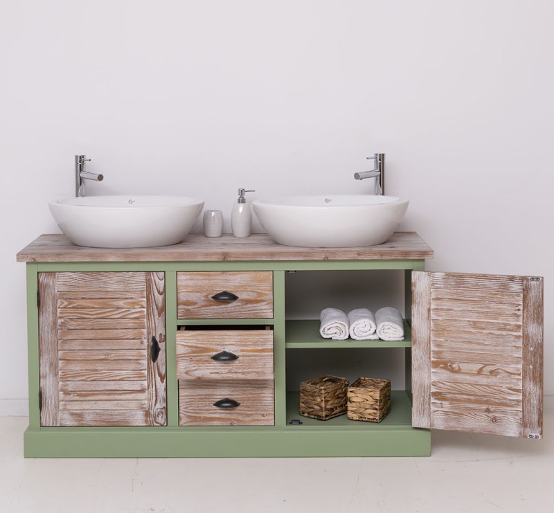 Unser Landhausstil Waschbeckenunterschrank mit zwei Lamellentüren und drei Schubladen ist die ideale Ergänzung für Ihr Badezimmer. Dieses Möbelstück vereint praktische Funktionalität mit einem ansprechenden Design und wird aus hochwertigem Massivholz gefertigt. Eleganz und Nützlichkeit in einem: Gestalten Sie Ihr Badezimmer mit einem Möbelstück, das sowohl in Bezug auf sein Design als auch auf seine Funktionalität überzeugt. Vielfältige Gestaltungsmöglichkeiten: Wählen Sie zwischen verschiedenen Tischplatten, darunter massives Kiefernholz, Eichenholz oder eine verzinkte Tischplatte, um die Oberfläche noch widerstandsfähiger zu gestalten. Beachten Sie, dass das Waschbecken und der Wasserhahn nicht im Lieferumfang enthalten sind, jedoch passende Optionen auf unserer Website erhältlich sind, um Ihr Badezimmer perfekt abzustimmen. Großzügiger Stauraum: Unser Waschbeckenunterschrank bietet ausreichend Platz hinter zwei Lamellentüren und drei Schubladen. Pflegehinweise: Die Reinigung ist unkompliziert - verwenden Sie einfach ein leicht feuchtes Tuch, um Staub und Schmutz zu entfernen. Aufgrund der spezifischen Eigenschaften von Massivholz empfehlen wir, den Schrank nach Kontakt mit Wasser mit einem trockenen Tuch abzuwischen und trocken zu halten. Verleihen Sie Ihrem Badezimmer mit unserem hochwertigen Waschbeckenunterschrank im Landhausstil ein stilvolles und funktionales Upgrade. Bestellen Sie jetzt und verwandeln Sie Ihr Badezimmer in einen Ort der Exzellenz und Raffinesse! Abmessungen: H: 75 cm, B: 150 cm, T: 51 cm Außenfarbe - frei wählbar Innenfarbe - frei wählbar Massivholz Möbel Landhausstil Tischplatte 100% Kiefernholz Korpus 100% Kiefernholz verschiedene Farben wählbar Beschläge/Griffe wählbar Oberflächen und Farben sind frei wählbar. 36 Farben und 8 Oberflächen (lackiert/gewachst/natur usw.) - Andere Abmessungen und Sonderanfertigungen sind möglich. Bitte Fragen Sie uns.
