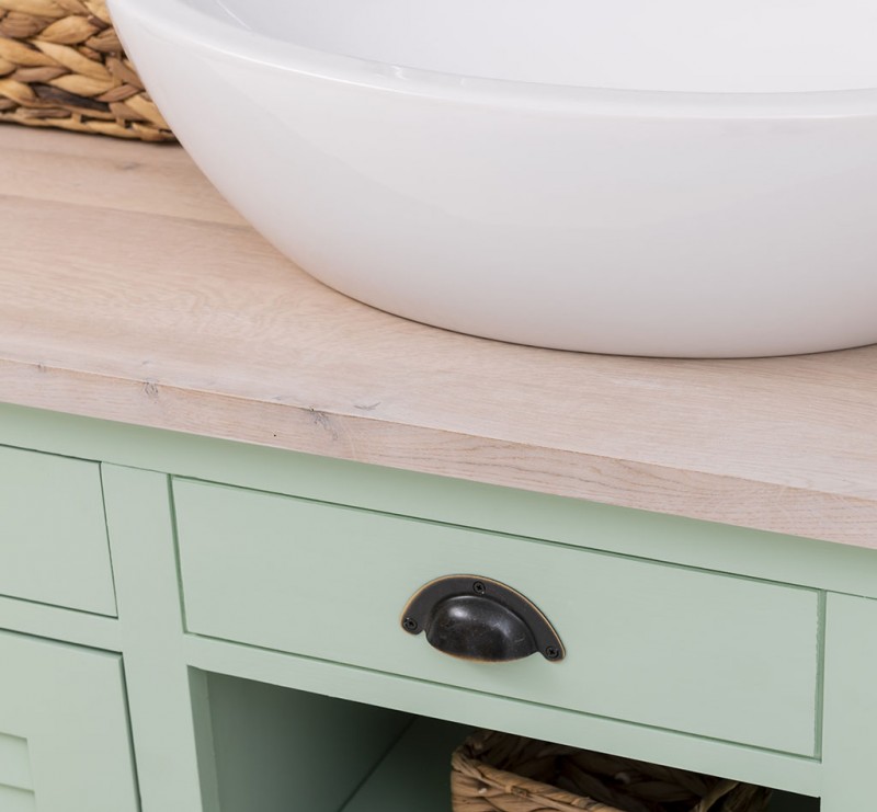 Unser Landhausstil Waschbeckenunterschrank mit zwei Türen und zwei geräumigen Schubladen ist die ideale Ergänzung für Ihr Badezimmer. Dieses Möbelstück vereint praktische Funktionalität mit einem ansprechenden Design und wird aus hochwertigem Massivholz gefertigt. Eleganz und Nützlichkeit in einem: Gestalten Sie Ihr Badezimmer mit einem Möbelstück, das sowohl in Bezug auf sein Design als auch auf seine Funktionalität überzeugt. Vielfältige Gestaltungsmöglichkeiten: Wählen Sie zwischen verschiedenen Tischplatten, darunter massives Kiefernholz, Eichenholz oder eine verzinkte Tischplatte, um die Oberfläche noch widerstandsfähiger zu gestalten. Beachten Sie, dass das Waschbecken nicht im Lieferumfang enthalten ist, jedoch passende Optionen auf unserer Website erhältlich sind, um Ihr Badezimmer perfekt abzustimmen. Großzügiger Stauraum: Unser Waschbeckenunterschrank bietet ausreichend Platz hinter seinen zwei Türen und zusätzlich in den beiden Schubladen. Pflegehinweise: Die Reinigung ist unkompliziert - verwenden Sie einfach ein leicht feuchtes Tuch, um Staub und Schmutz zu entfernen. Aufgrund der spezifischen Eigenschaften von Massivholz empfehlen wir, den Schrank nach Kontakt mit Wasser mit einem trockenen Tuch abzuwischen und trocken zu halten. Verleihen Sie Ihrem Badezimmer mit unserem hochwertigen Waschbeckenunterschrank im Landhausstil ein stilvolles und funktionales Upgrade. Bestellen Sie jetzt und verwandeln Sie Ihr Badezimmer in einen Ort der Exzellenz und Raffinesse! Abmessungen: H: 90 cm, B: 90 cm, T: 51 cm Außenfarbe - frei wählbar Innenfarbe - frei wählbar Massivholz Möbel Landhausstil Tischplatte 100% Eichenholz Korpus 100% Kieferholz verschiedene Farben wählbar Beschläge/Griffe wählbar Oberflächen und Farben sind frei wählbar. 36 Farben und 8 Oberflächen (lackiert/gewachst/natur usw.) - Andere Abmessungen und Sonderanfertigungen sind möglich. Bitte Fragen Sie uns.