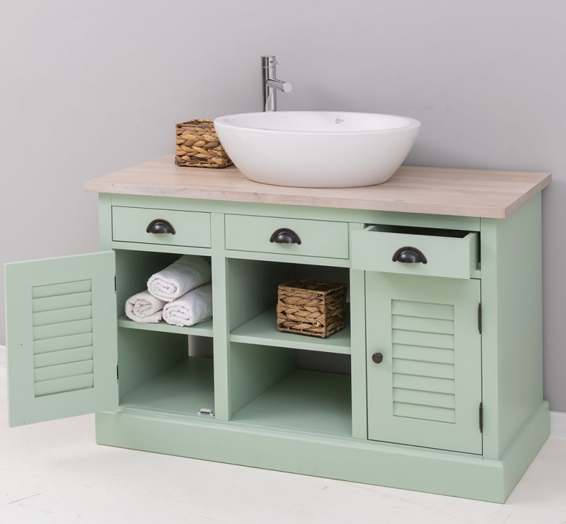 Unser Landhausstil Waschbeckenunterschrank mit zwei Lamellentüren, zwei Schubladen (dritte nur Blende) und zwei Fächern ist die ideale Ergänzung für Ihr Badezimmer. Dieses Möbelstück vereint praktische Funktionalität mit einem ansprechenden Design und wird aus hochwertigem Massivholz gefertigt. Eleganz und Nützlichkeit in einem: Gestalten Sie Ihr Badezimmer mit einem Möbelstück, das sowohl in Bezug auf sein Design als auch auf seine Funktionalität überzeugt. Vielfältige Gestaltungsmöglichkeiten: Wählen Sie zwischen verschiedenen Tischplatten, darunter massives Kiefernholz, Eichenholz oder eine verzinkte Tischplatte, um die Oberfläche noch widerstandsfähiger zu gestalten. Beachten Sie, dass das Waschbecken und der Wasserhahn nicht im Lieferumfang enthalten sind, jedoch passende Optionen auf unserer Website erhältlich sind, um Ihr Badezimmer perfekt abzustimmen. Großzügiger Stauraum: Unser Waschbeckenunterschrank bietet ausreichend Platz hinter zwei Lamellentür, zwei Schubladen und in den zwei Fächern. Pflegehinweise: Die Reinigung ist unkompliziert - verwenden Sie einfach ein leicht feuchtes Tuch, um Staub und Schmutz zu entfernen. Aufgrund der spezifischen Eigenschaften von Massivholz empfehlen wir, den Schrank nach Kontakt mit Wasser mit einem trockenen Tuch abzuwischen und trocken zu halten. Verleihen Sie Ihrem Badezimmer mit unserem hochwertigen Waschbeckenunterschrank im Landhausstil ein stilvolles und funktionales Upgrade. Bestellen Sie jetzt und verwandeln Sie Ihr Badezimmer in einen Ort der Exzellenz und Raffinesse! Kommode wird ohne Waschbecken geliefert. Abmessungen: H: 75 cm, B: 120 cm, T: 51 cm Massivholz Möbel Landhausstil Tischplatte 100% Eichenholz Korpus 100% Kiefernholz verschiedene Farben wählbar Beschläge/Griffe wählbar