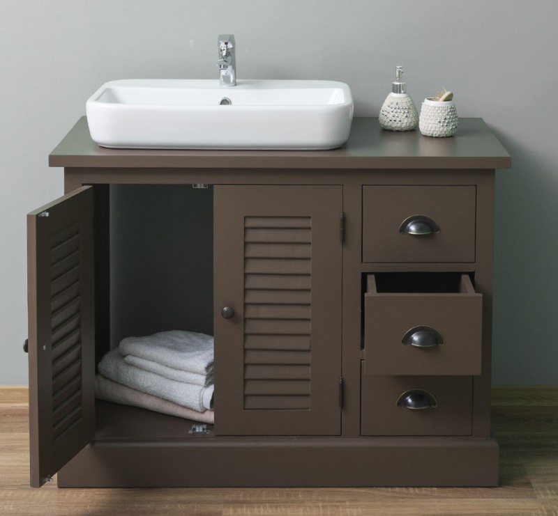 Großzügiger Stauraum: Unser Waschbeckenunterschrank bietet ausreichend Platz hinter seinen zwei Lamellentüren und den drei Schubladen.