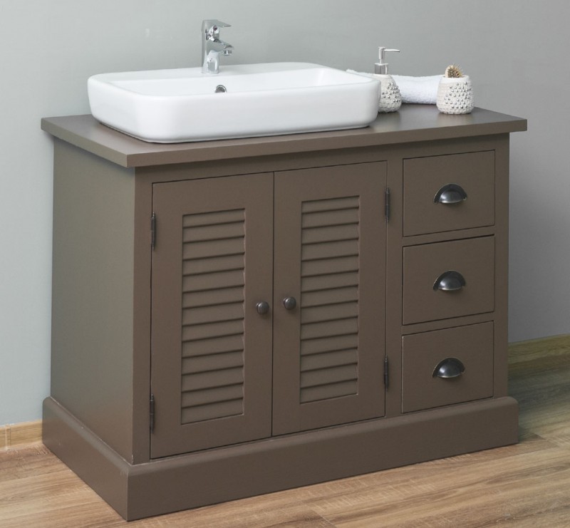 Unser Landhausstil Waschbeckenunterschrank mit zwei Lamellentüren und drei Schubladen ist die ideale Ergänzung für Ihr Badezimmer. Dieses Möbelstück vereint praktische Funktionalität mit einem ansprechenden Design und wird aus hochwertigem Massivholz gefertigt.