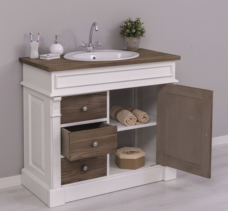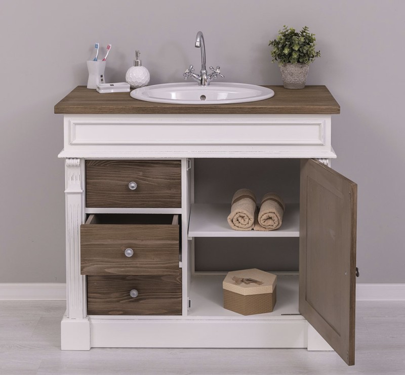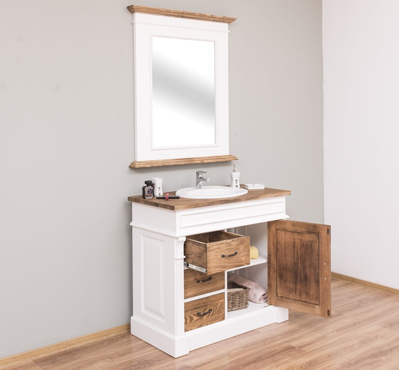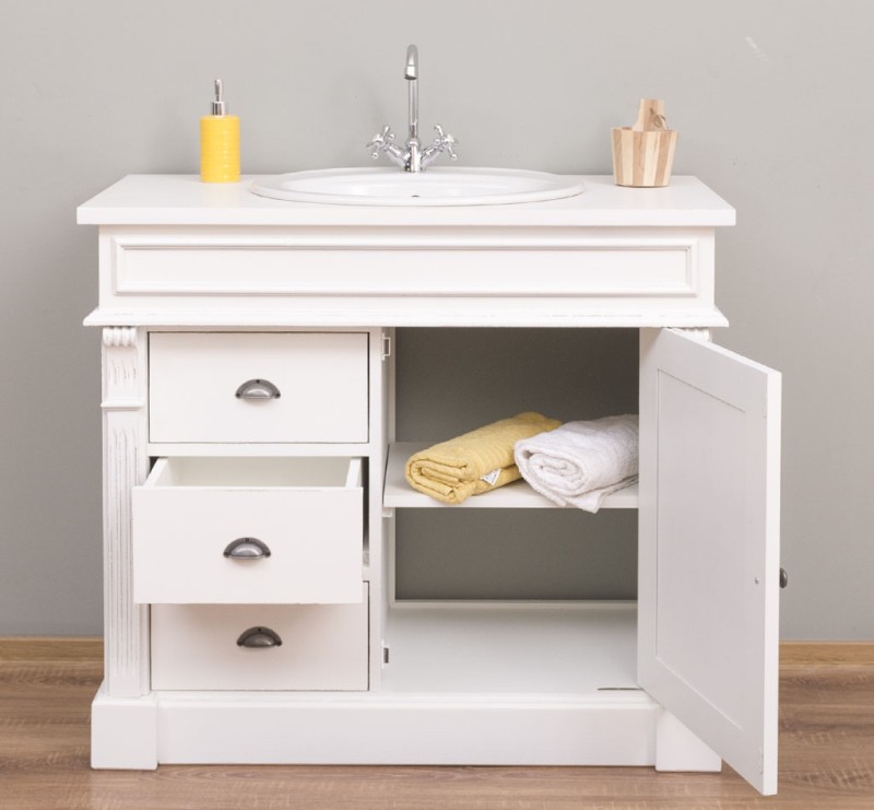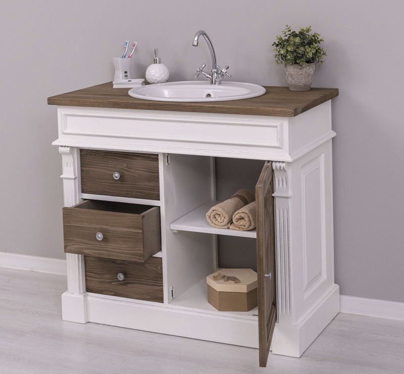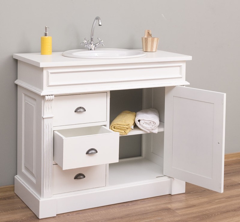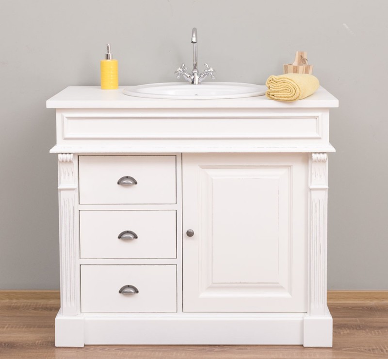 Unser Landhausstil Waschbeckenunterschrank mit einer Tür und drei Schubladen ist die ideale Ergänzung für Ihr Badezimmer. Dieses Möbelstück vereint praktische Funktionalität mit einem ansprechenden Design und wird aus hochwertigem Massivholz gefertigt.