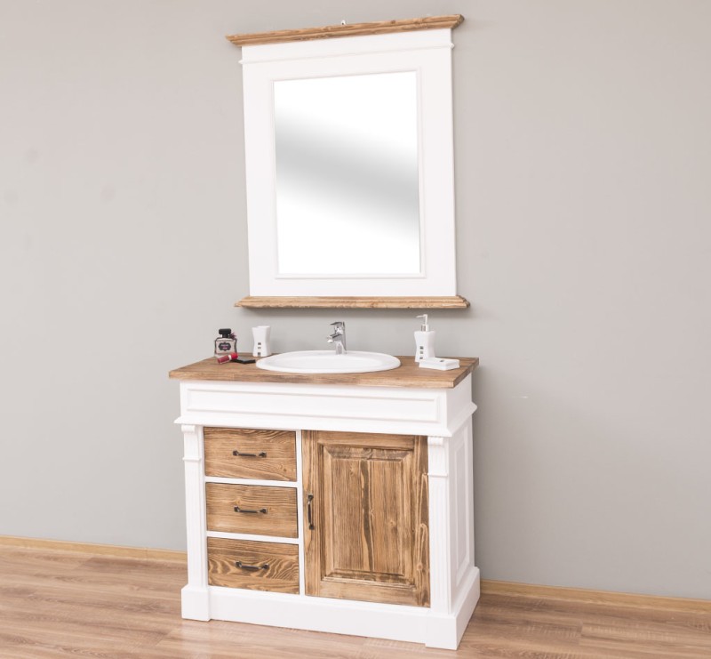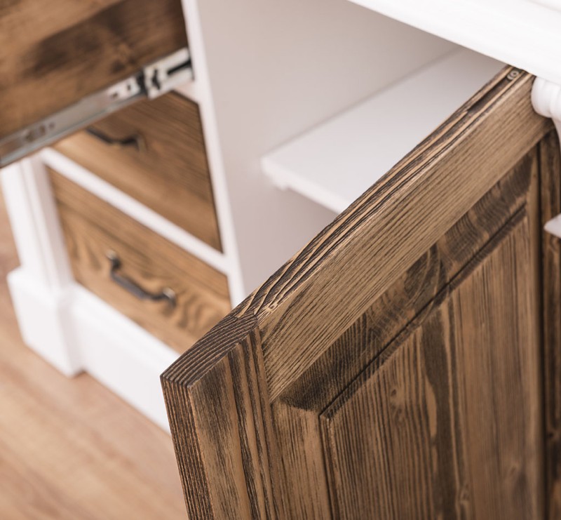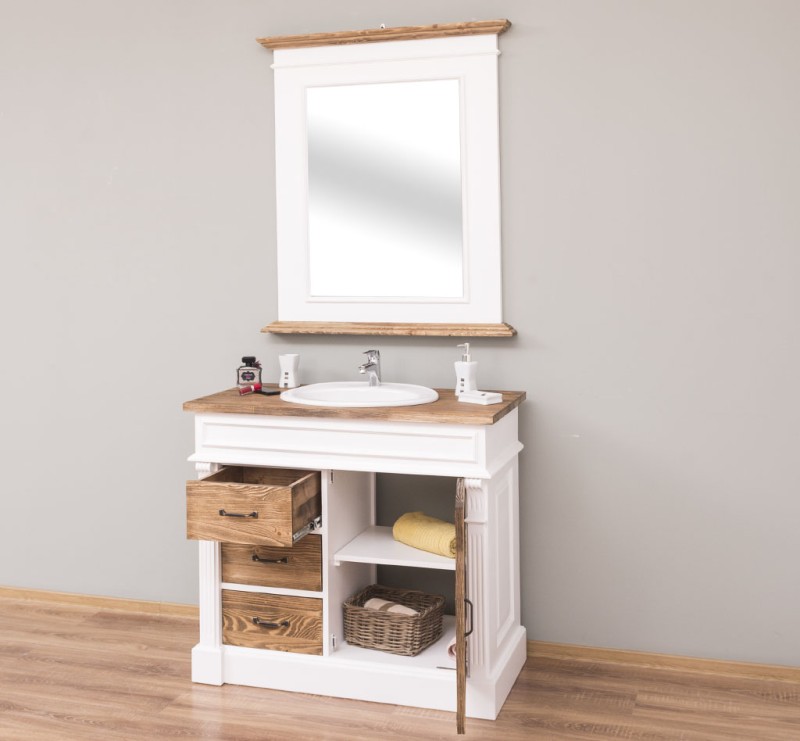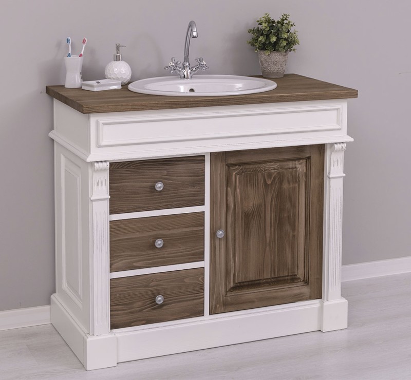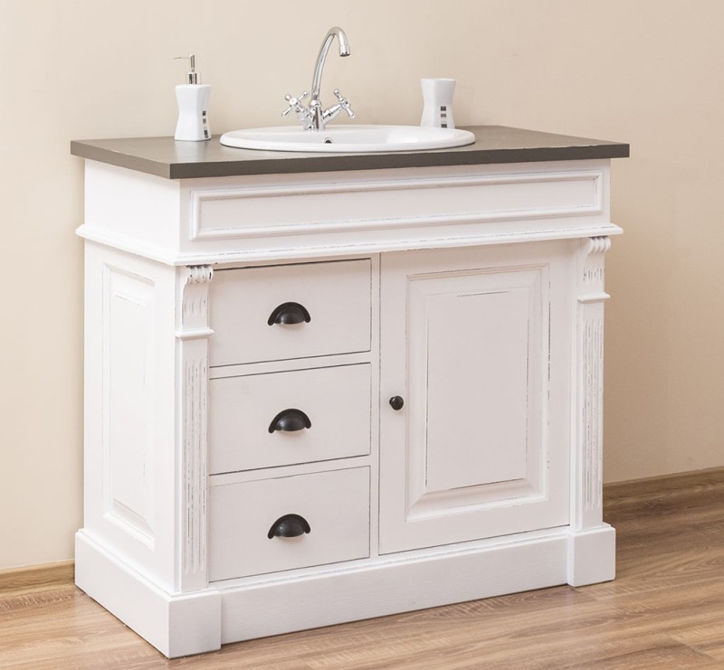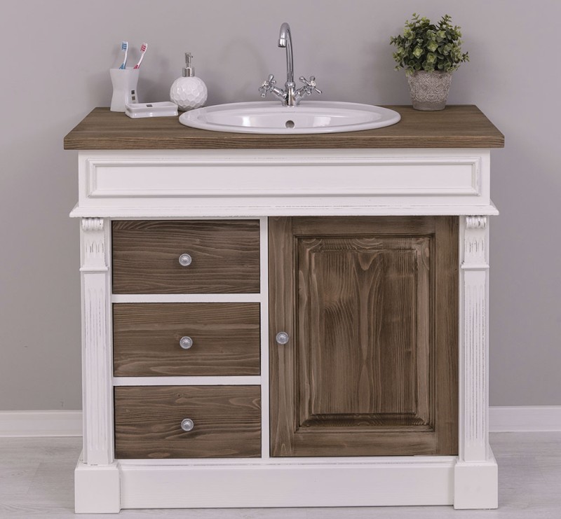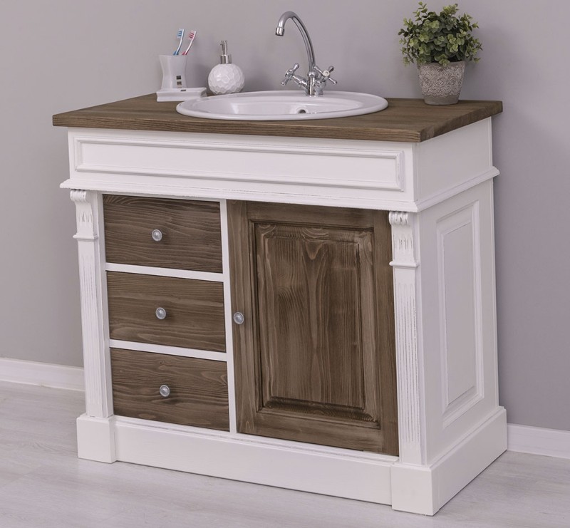 Unser Landhausstil Waschbeckenunterschrank mit einer Tür und drei Schubladen ist die ideale Ergänzung für Ihr Badezimmer. Dieses Möbelstück vereint praktische Funktionalität mit einem ansprechenden Design und wird aus hochwertigem Massivholz gefertigt.