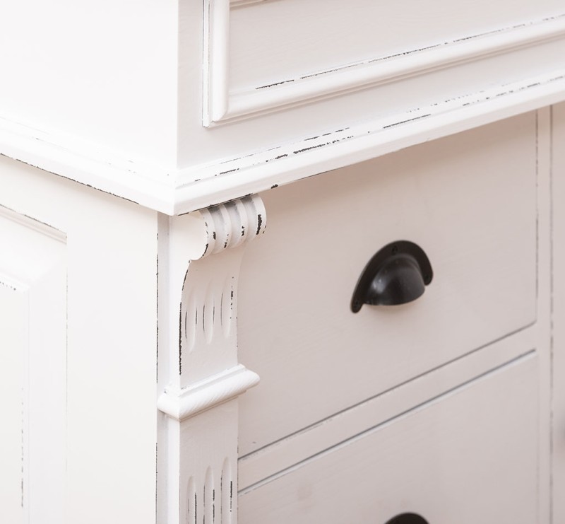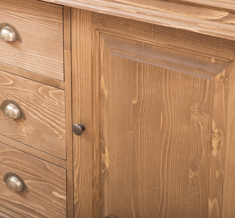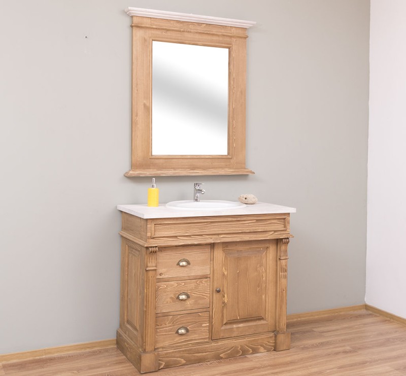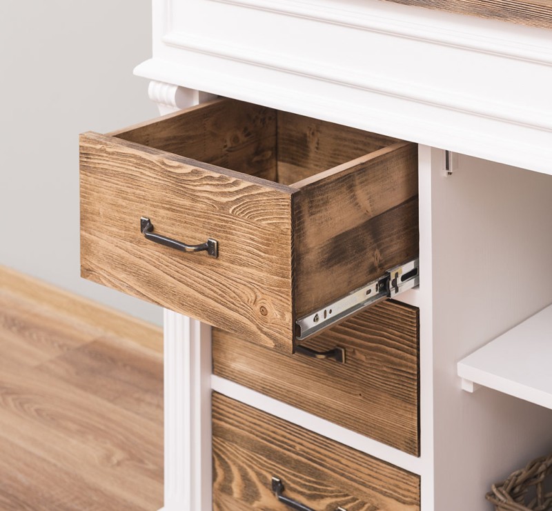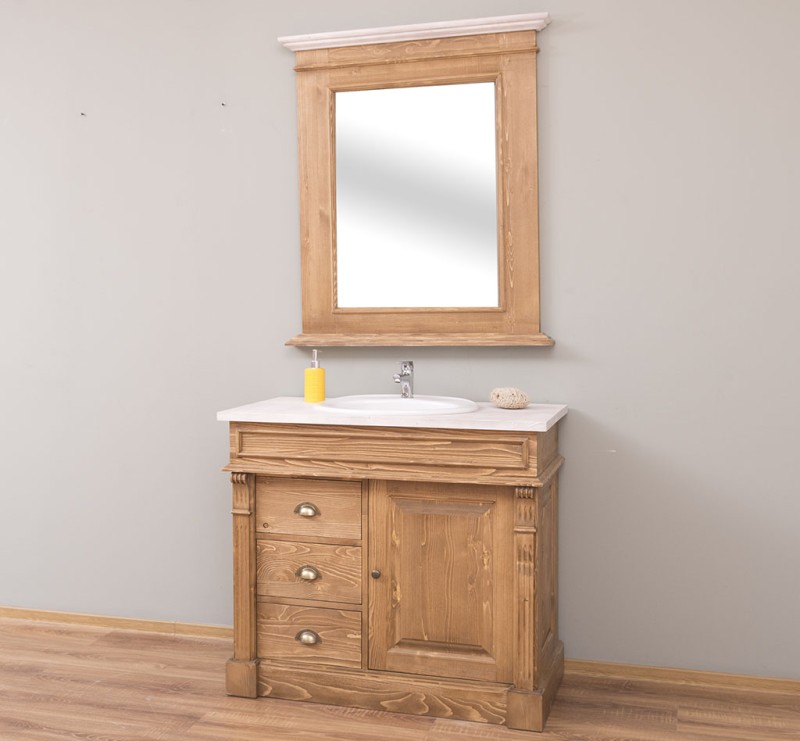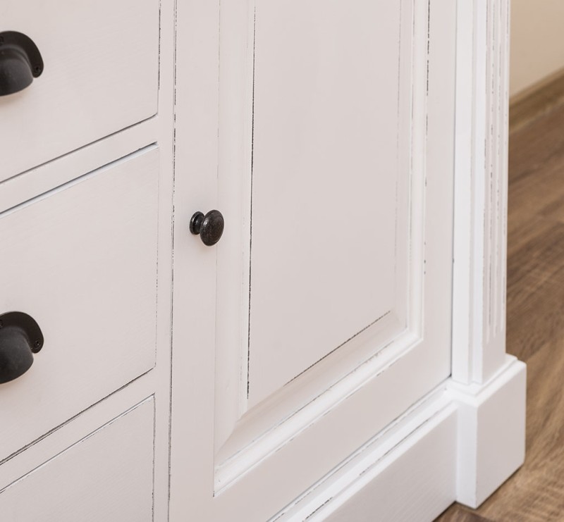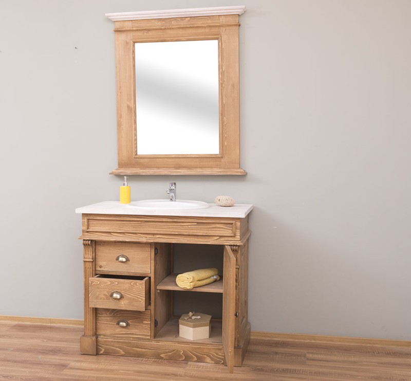 Unser Landhausstil Waschbeckenunterschrank mit einer Tür und drei Schubladen ist die ideale Ergänzung für Ihr Badezimmer. Dieses Möbelstück vereint praktische Funktionalität mit einem ansprechenden Design und wird aus hochwertigem Massivholz gefertigt.