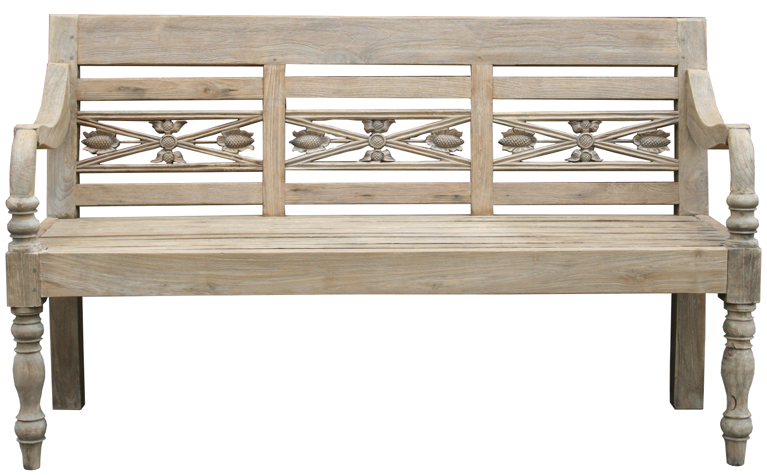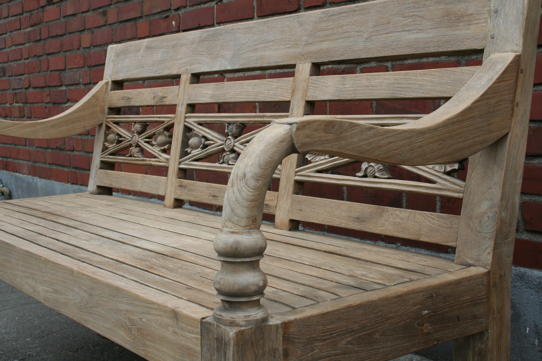 Eine schöne Gartenbank aus massivem Teakholz. Für die Bank wurde altes Teakholz verwendet, das aus alten Möbeln und aus Häusern recycelt wurde. Das Holz ist sehr alt und entsprechend lebendig. Die Bank kann sofort ohne Oberflächenbehandlung genutzt werden. Unsere Teak Bänke sind naturbelassen und haben ein ganz besonderes natürliches Aussehen. Abweichungen in Struktur und Farbe sind handelsüblich und unvermeidbar. Auch die Blumenmuster können unterschiedlich sein. Jede Bank ist ein Unikat. Teak Gartenmöbel, Teakmöbel, Outdoor-Möbel, Garten Bänke, Sitzbank Teak, antike Teak Tische & Bänke. Material: Teak massiv Abmessungen: ca. H/B/T: 90/190/60 cm Sitzfläche tiefe. 47 cm Sitzhöhe: 45 cm Armlehnen: 72 cm recyceltes Teakholz robuste Verarbeitung Outdoor-Gartenmöbel Lieferzustand: demontiert