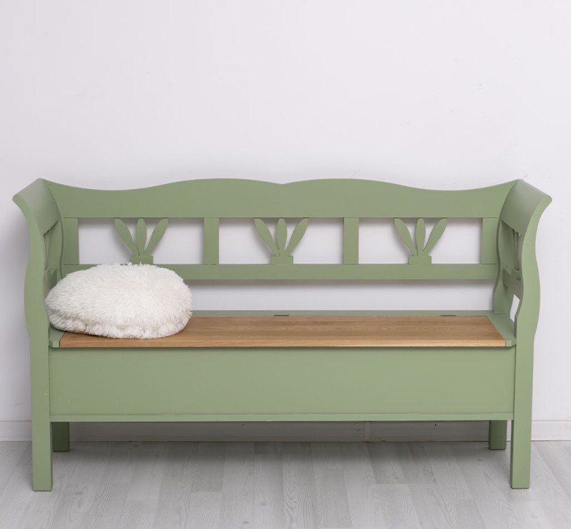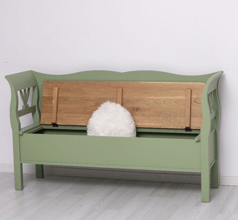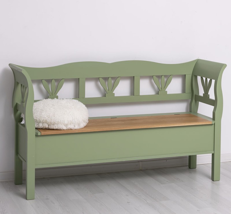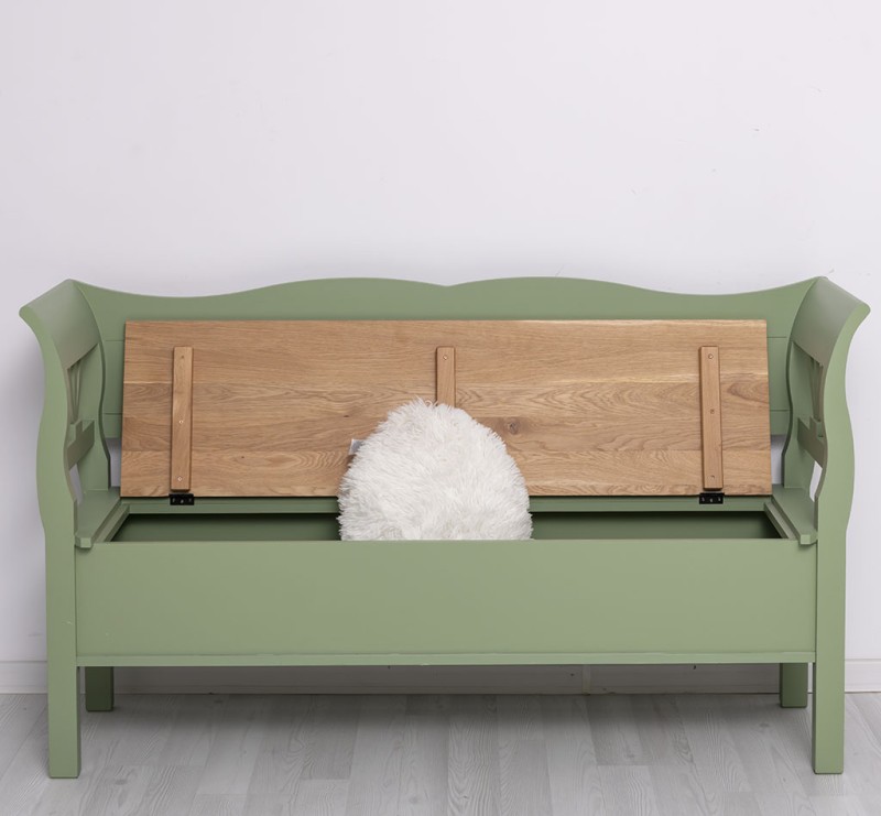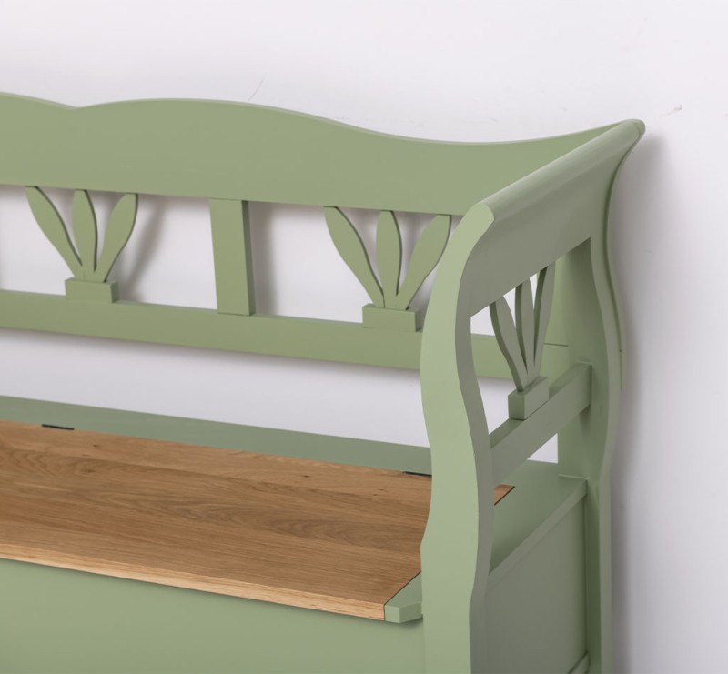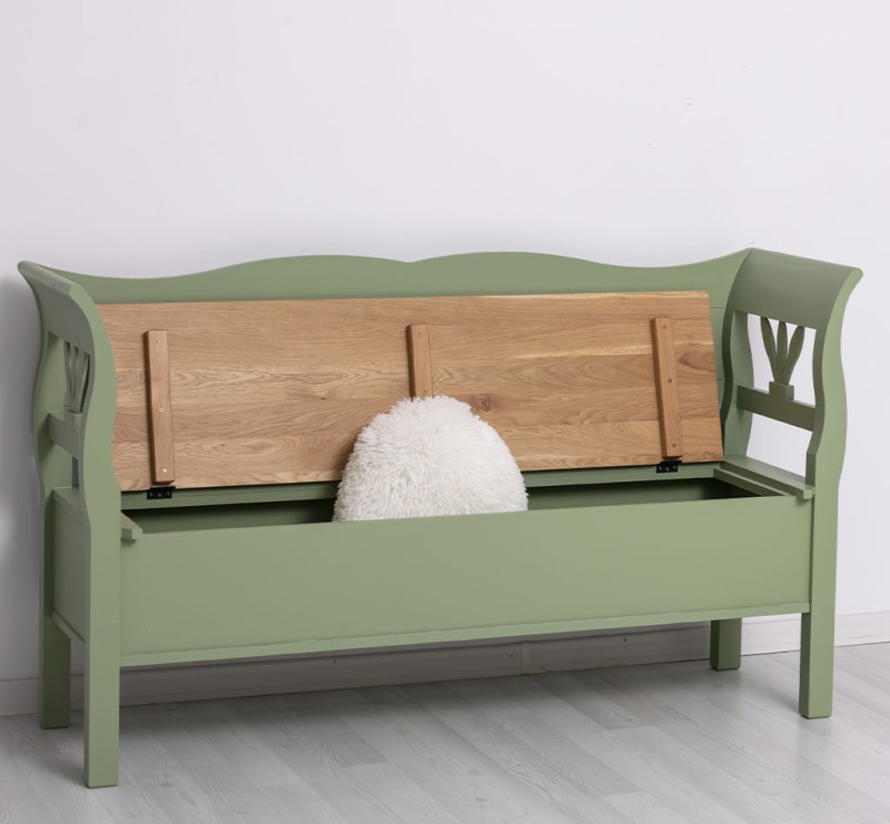 Zudem verfügt diese Bank über einen praktischen Stauraum, in dem Sie Decken, Kissen und andere Utensilien unauffällig verstauen können. Ihr rustikaler Landhausstil und die ansprechende grüne Farbgebung sorgen für ein natürliches Ambiente, das sich nahtlos in jede Einrichtung einfügt.