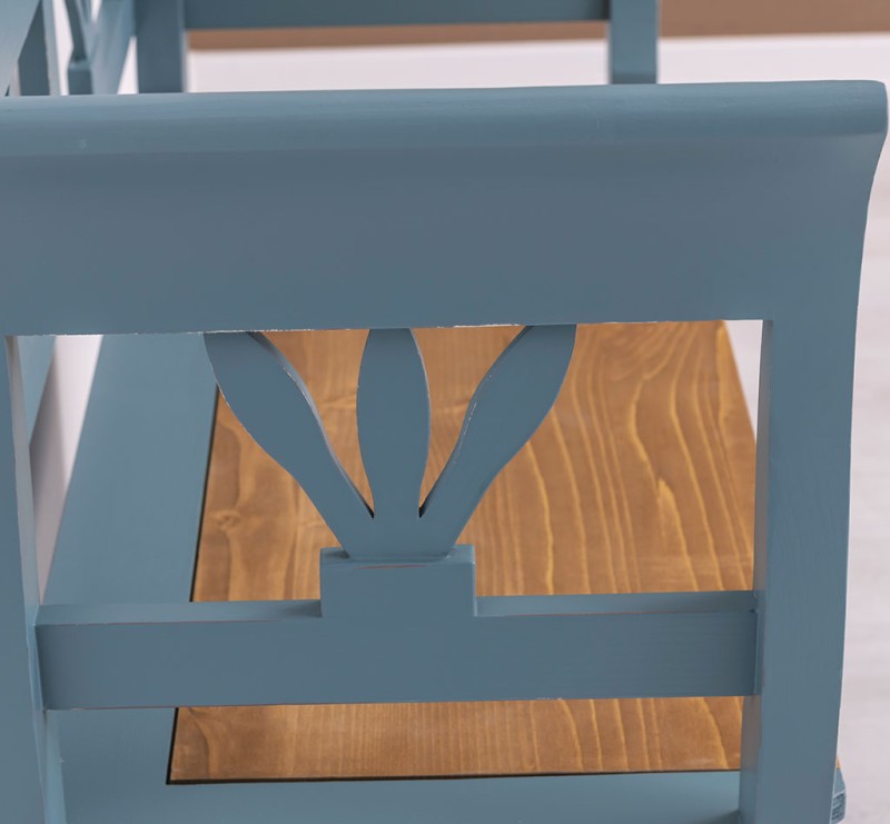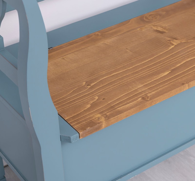 Die charmante Sitzbank im Landhausstil mit einer robusten Eichenplatte ist eine ideale Ergänzung für Ihre Küche oder Ihr Esszimmer. Sie bietet nicht nur eine komfortable Rückenlehne und ausreichend Platz für mehrere Personen, sondern ist auch aus hochwertigem Holz gefertigt und sorgfältig verarbeitet, was ihr Langlebigkeit und eine gemütliche Ausstrahlung verleiht. Zudem verfügt diese Bank über einen praktischen Stauraum, in dem Sie Decken, Kissen und andere Utensilien unauffällig verstauen können. Ihr rustikaler Landhausstil und die ansprechende grüne Farbgebung sorgen für ein natürliches Ambiente, das sich nahtlos in jede Einrichtung einfügt. Die Sitzfläche aus Eichenholz garantiert nicht nur Stabilität und Strapazierfähigkeit, sondern macht die Bank auch zum dekorativen Highlight in jedem Raum. Nutzen Sie die vielseitigen Möglichkeiten dieser Truhenbank und erhöhen Sie den Komfort und Stil in Ihrem Zuhause. Die Abmessungen: ca.: Höhe 92 cm-Breite 163 cm - Tiefe 48 cm. Stauraum Landhausstil Farbe: blau braun Sitzplatte aus 100% Eiche Sitzhöhe ca. 46 cm Sitztiefe ca. 44 cm Tiefe der Truhe ca. 30 cm Fertig montiert Artikelgewicht: 25 kg