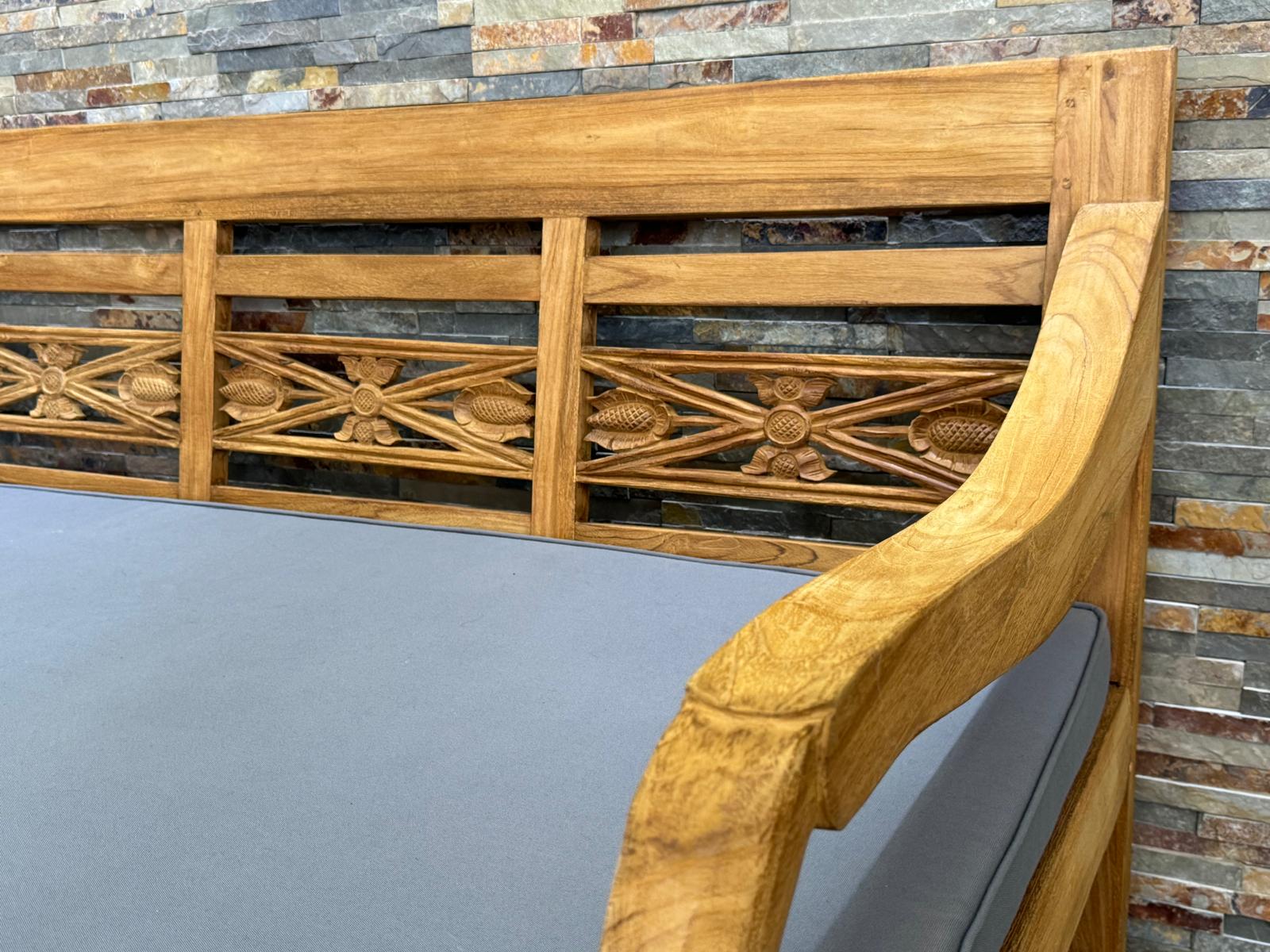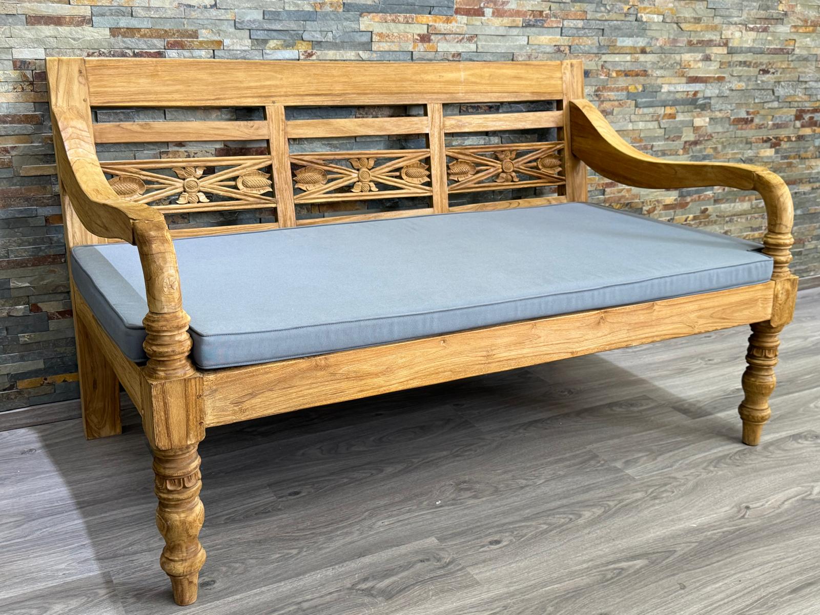 Diese robuste und massive Lounge Bank ist aus recyceltem Teak. Das alte Teak Holz ist witterungsbeständig und outdoor geeignet. Geniessen Sie die Nachmittage in dieser bequemen Bank mit dem passenden Kissen und entspannen Sie. Unsere Teak Gartenmöbel passen zu jedem Garten Stil. Diese Teak Bank ist sowohl für den Innen als auch dem Außenbereich geeignet.