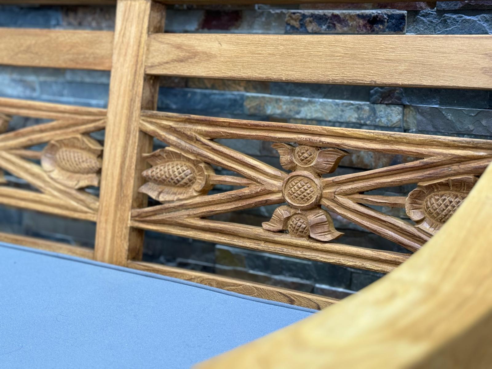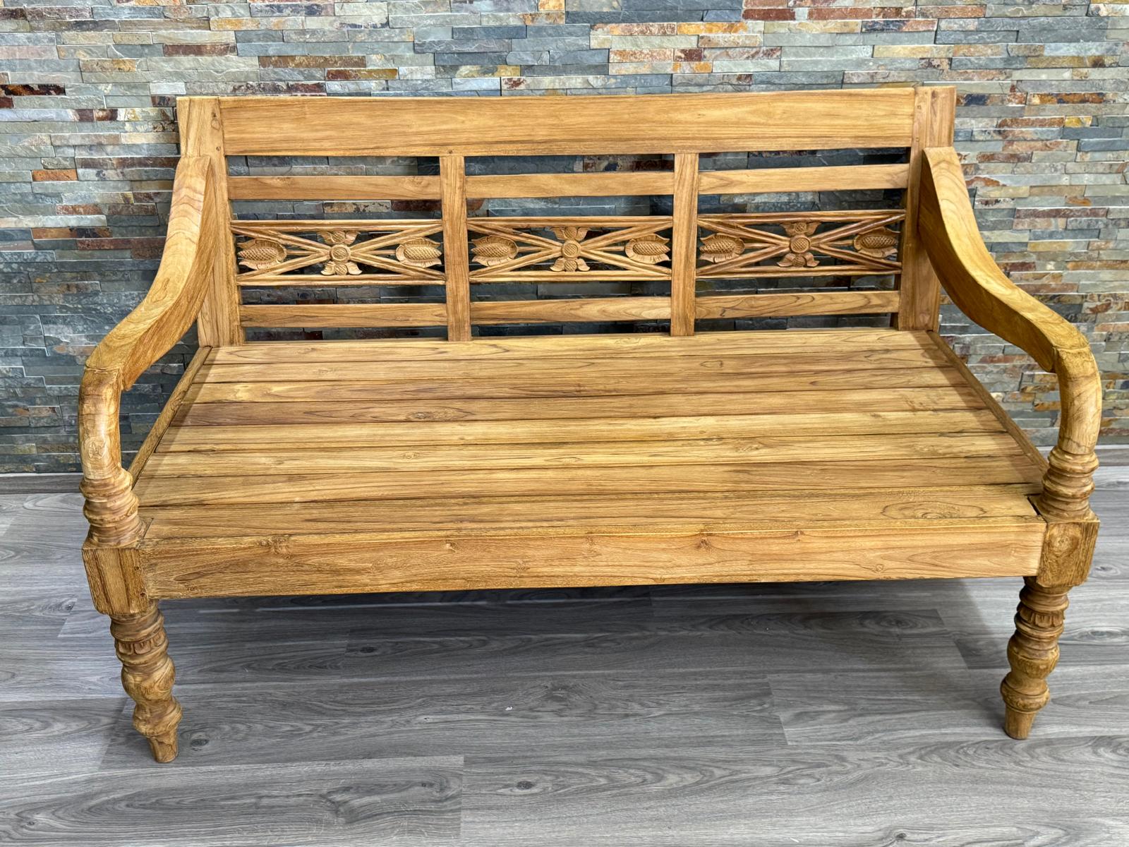 Eine schöne Gartenbank aus massivem Teakholz. Für die Bank wurde altes Teakholz verwendet, das aus alten Möbeln und aus Häusern recycelt wurde. Das Holz ist sehr alt und entsprechend lebendig. Die Bank kann sofort ohne Oberflächenbehandlung genutzt werden. Unsere Teak Bänke sind naturbelassen und haben ein ganz besonderes natürliches Aussehen. Abweichungen in Struktur und Farbe sind handelsüblich und unvermeidbar. Auch die Blumenmuster können unterschiedlich sein. Jede Bank ist ein Unikat. Teak Gartenmöbel, Teakmöbel, Outdoor-Möbel, Garten Bänke, Sitzbank Teak, antike Teak Tische & Bänke. Material: Teak massiv Abmessungen: ca. H/B/T: 90/190/60 cm Sitzfläche tiefe. 47 cm Sitzhöhe: 45 cm Armlehnen: 72 cm recyceltes Teakholz robuste Verarbeitung Outdoor-Gartenmöbel Lieferzustand: demontiert