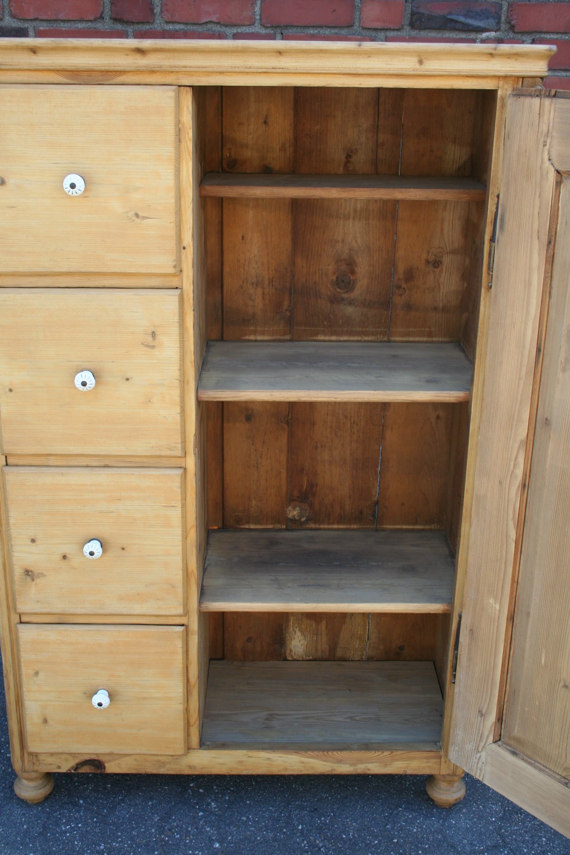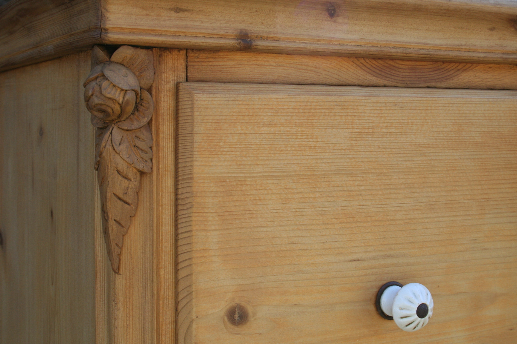 Ein Weichholz Brotschrank im wohnfertigem Zustand. Mit Bienenwachs behandelt und aufpoliert. Der Schrank ist in einem guten Zustand. Im Schrank sind zwei Einlegeböden angebracht. Mit 4 Schubladen. Es sind Schloss und Schlüssel vorhanden und voll funktionsfähig. Der Schrank ist voll massiv. Ein schöner Schrank für ihren Wohnbereich! Leichte Abweichungen bei Griffen, Schnecken, Verzierungen und Beschlägen sowie den Abmessungen sind möglich.