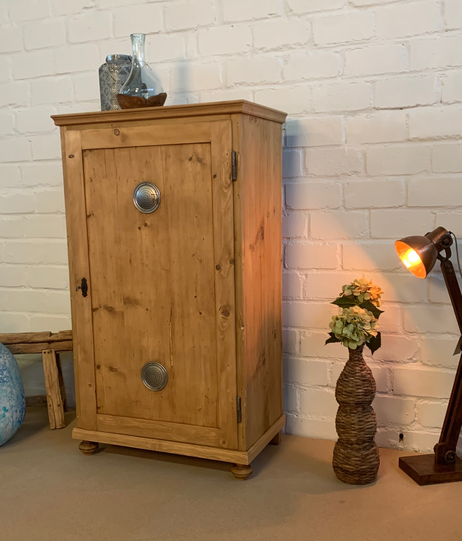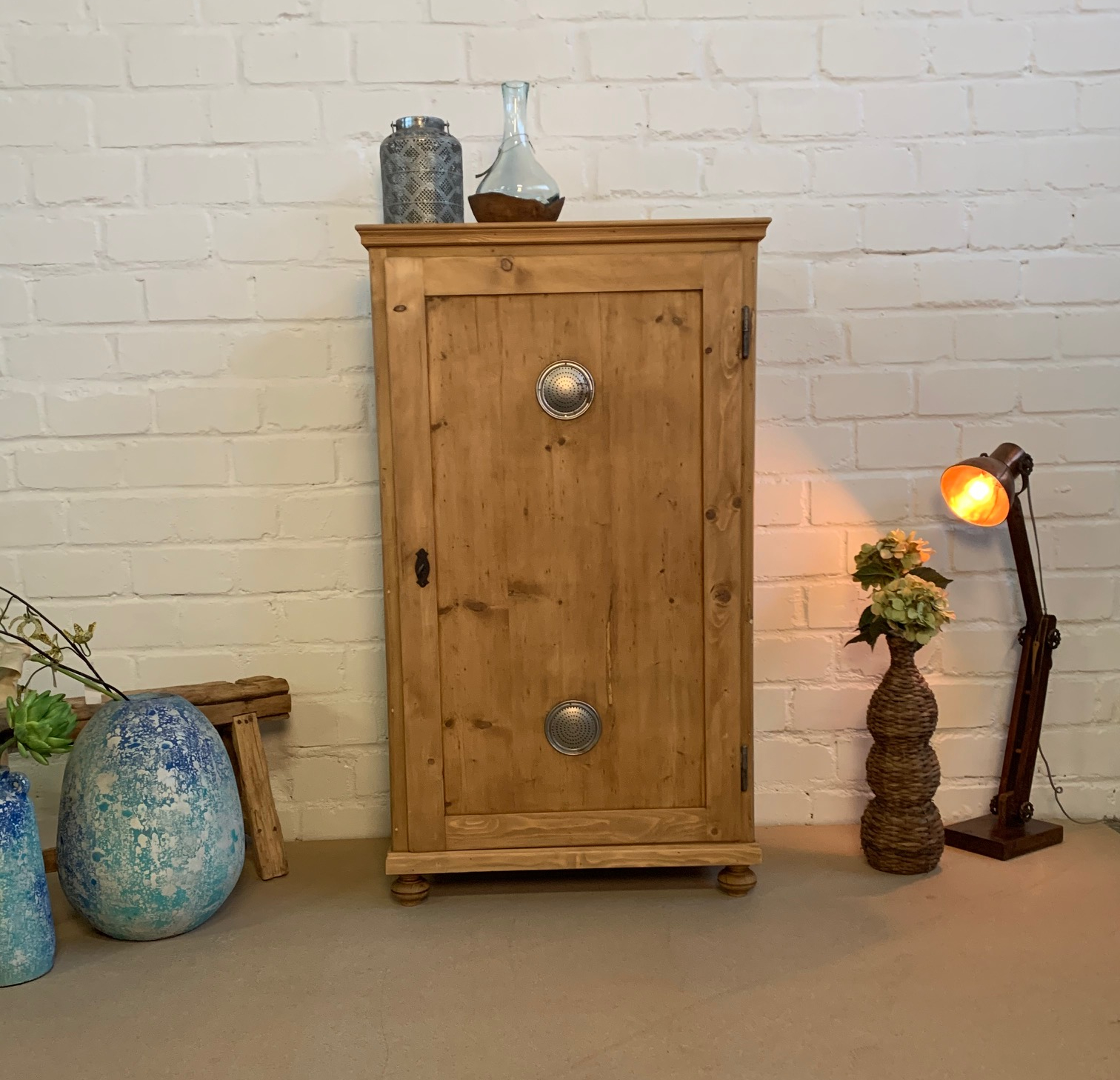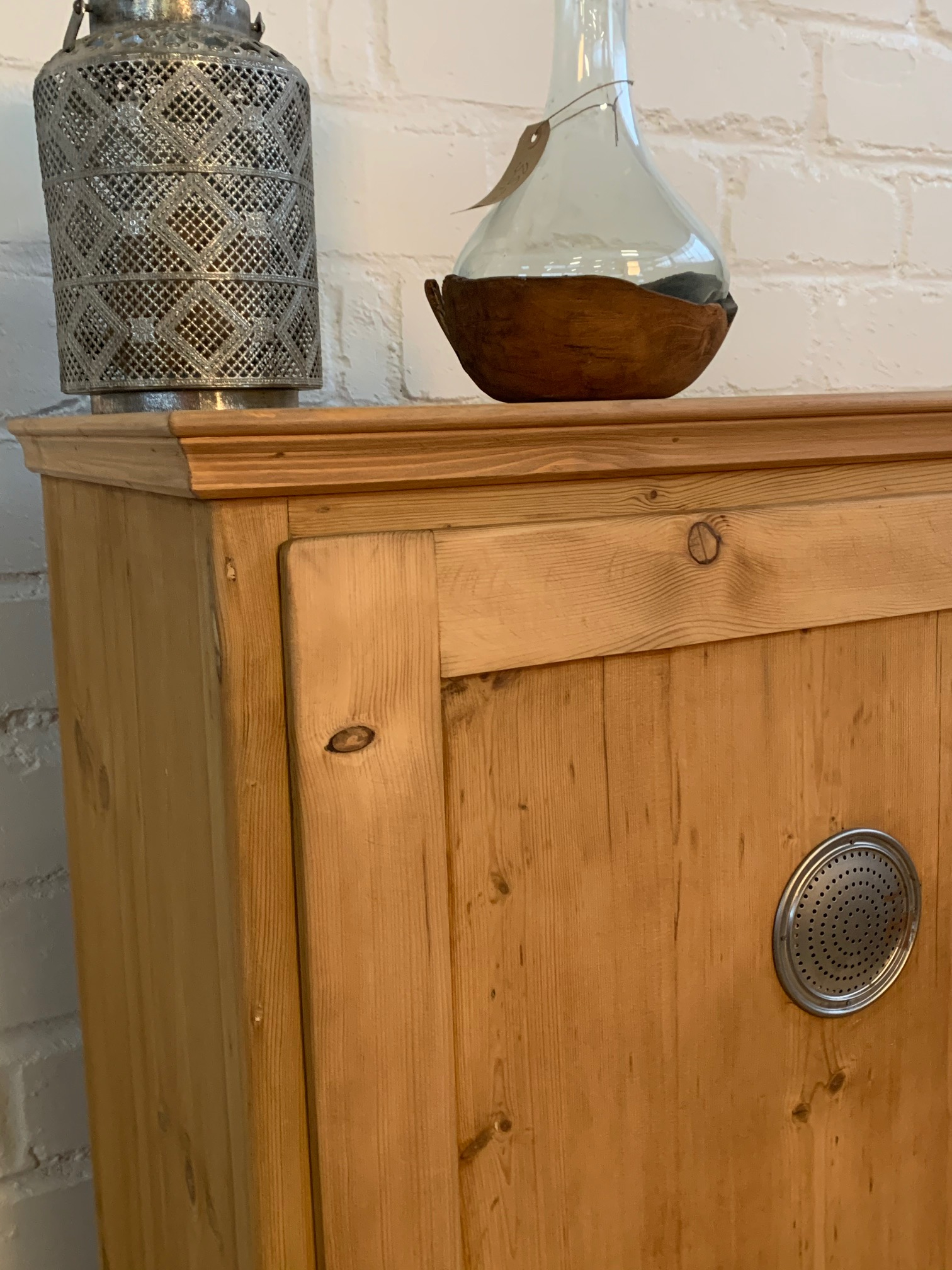 Ein Weichholz Brotschrank, der sich direkt in Ihre Wohnung integriert. Der Schrank ist mit mit Bienenwachs behandelt und aufpoliert. Im Schrank sind Einlegeböden angebracht für Ihre persönliche Gegenstände. Es sind Schloss und Schlüssel vorhanden und voll funktionsfähig. Der Schrank ist voll massiv. Ein schöner Vorratsschrank für Ihren Wohnbereich!