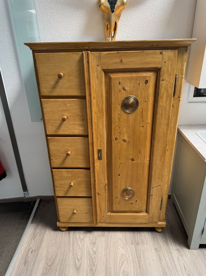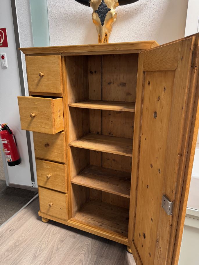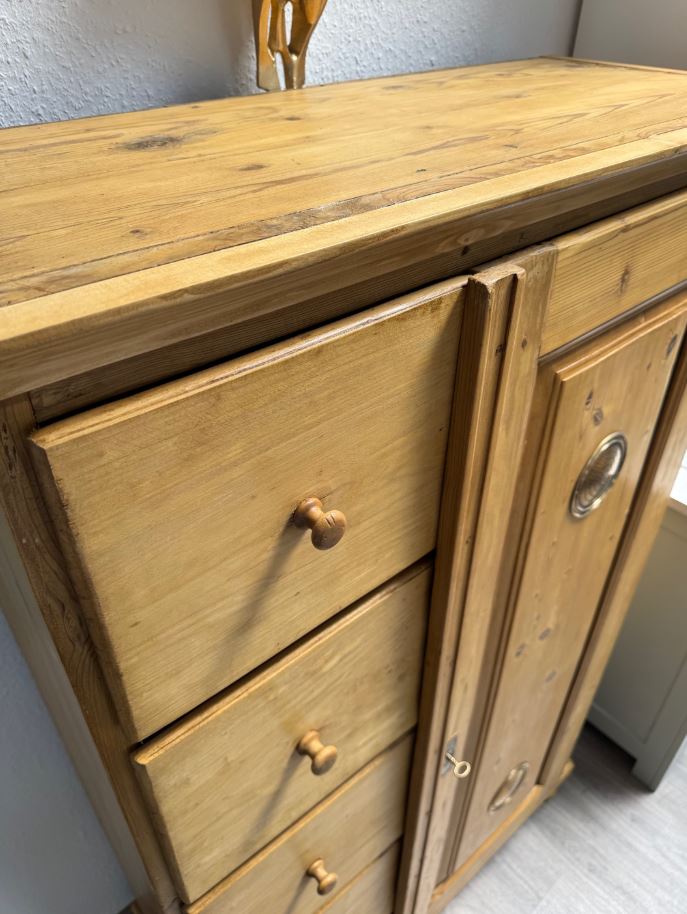 Ein Weichholz Brotschrank im wohnfertigen Zustand. Mit Bienenwachs behandelt und aufpoliert. Im Schrank sind Einlegeböden. Die fünf großen Schubladen sind mit Holzknöpfen ausgestattet. Es sind Schloss und Schlüssel vorhanden und sind voll funktionsfähig. Der Schrank ist voll massiv. Ein schöner Eyecatcher und ein großartiges Einzelstück für Ihr Zuhause.