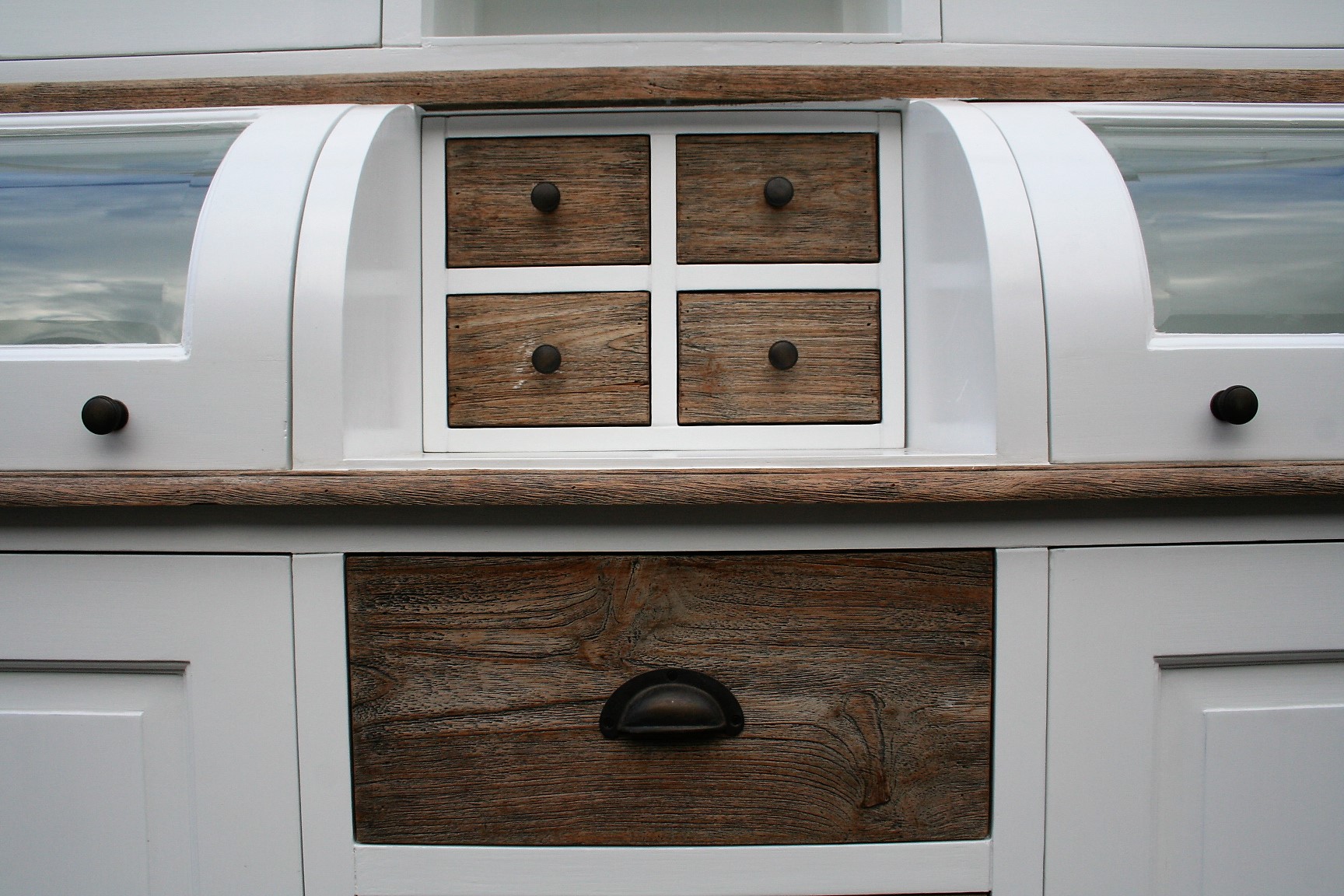 Ein großer Ladenschrank aus alten recycelten Dengkleh Teakholz. Unsere Teak Landhausmöbel sind hochwertig und zeitlos. Jedes Möbelstück wird individuell gefertigt. Das Unterteil bietet viel Stauraum hinter den Türen. Im oberen Bereich mit Glasfront, haben Sie die Möglichkeit Ihre Dekoartikel, Geschirr und Wohnaccessoires zu präsentieren. Das zweiteilige Teakholz Buffet ist 200 cm lang und 215 cm hoch. Unser großer Vitrinenschrank wird Sie sofort begeistern. Der Schrank passt hervorragend in ein großes offenes Wohnzimmmer oder in die neue Wohnküche. Ein massiver Teakholz Schrank aus altem recyceltem Dengkleh Holz. Abmessungen: H: 210 cm B: 200 cm T: 40/50 cm Details: recyceltes Dengkleh-Teak ein handgefertigtes Unikat fertig montiert 2-teilig