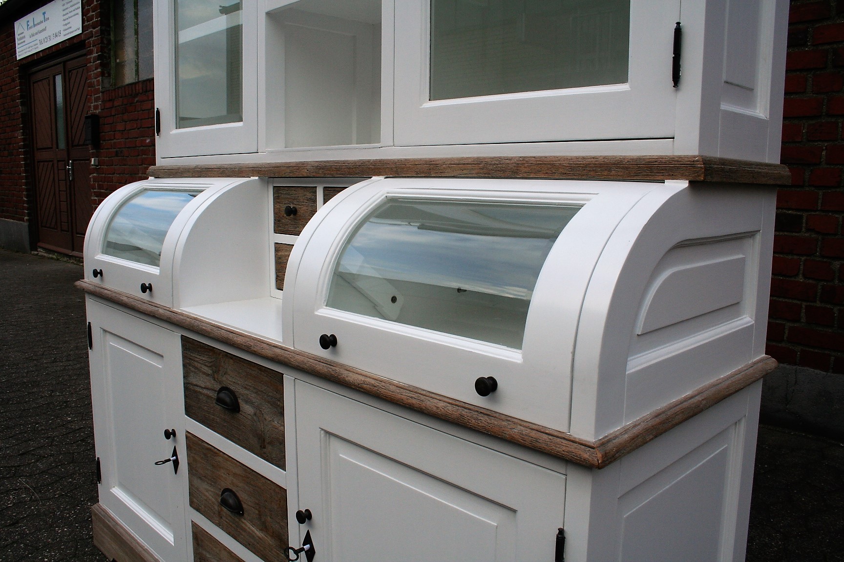 Ein schöner Buffet Schrank im Landhaus-Stil. Das 2-teilige Buffet ist ein zeitloses Möbelstück, welches überall in Ihrem Haus einen prägenden Eindruck hinterlässt. Mi viel Stauraum im unteren Bereich, bietet Ihnen der obere Bereich mit Glasfront die Möglichkeit, den Landhaus-Stil durch Wohnaccessoires zu unterstreichen. Der Schrank ist weißglänzend lackiert und mit schönen Eichenholzelementen ergänzt. Die Schubladen, der Kranz und die Leisten sind aus massivem Eichenholz. Jedes Möbelstück ist individuell gefertigt und ein schönes Unikat. Der 2-teilige Schrank wird nicht nur Ihr Eigenheim in neuem Glanz erstrahlen lassen, sondern durch seine Langlebigkeit und Anblick Sie auf Dauer erfreuen.