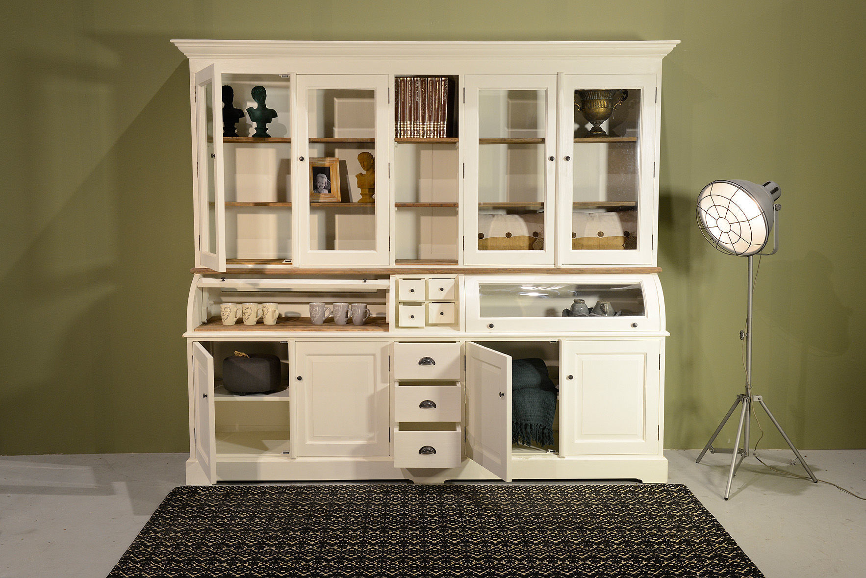 Der schöne Buffet Schrank im angesagten Landhaus-Stil ist ein hochwertiges und zeitloses Möbelstück, welches überall in Ihrem Haus einen prägenden Eindruck hinterlässt und eine gute Figur macht. Neben viel Stauraum im unteren Bereich, bietet Ihnen der obere Bereich mit Glasfront die Möglichkeit, den Landhaus-Stil durch Wohnaccessoires zu unterstreichen. Das Buffet ist weiß lackiert. Jedes Möbelstück ist ein handgefertigtes Unikat. Der Buffet Schrank wird nicht nur Ihr Eigenheim in neuem Glanz erstrahlen lassen, sondern durch seine Langlebigkeit und Anblick Sie auf Dauer erfreuen.