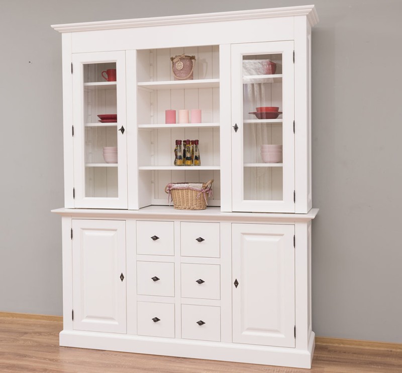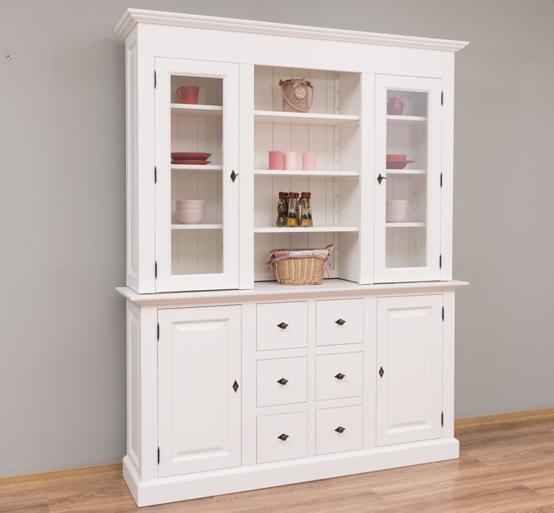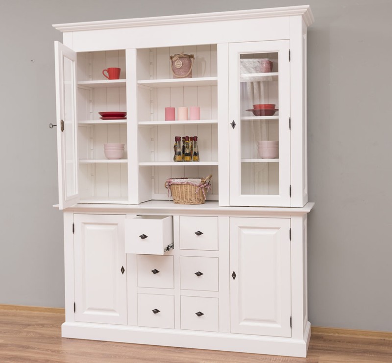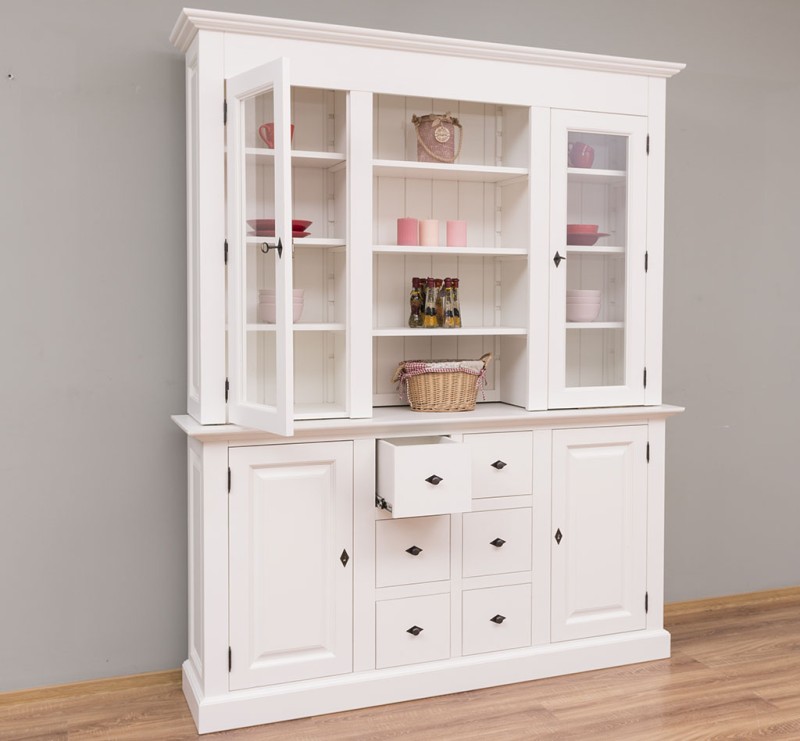 Erfreuen Sie sich an der klassischen Eleganz dieser Vitrine, welche nicht nur über zwei geschlossene Türen und sechs Schubladen verfügt, sondern auch hinter den zwei Glastüren und auf den offenen Regalböden Platz für Dekoration bietet. Diese Vitrine im Landhausstil ist ein hochwertiges, zeitloses Möbelstück, welches überall in Ihrem Haus einen prägenden Eindruck hinterlässt und eine gute Figur macht. Entdecken Sie die ideale Verbindung von Organisation und Präsentation. Dieses Möbelstück vereint auf elegante Weise Funktionalität und Ästhetik.
