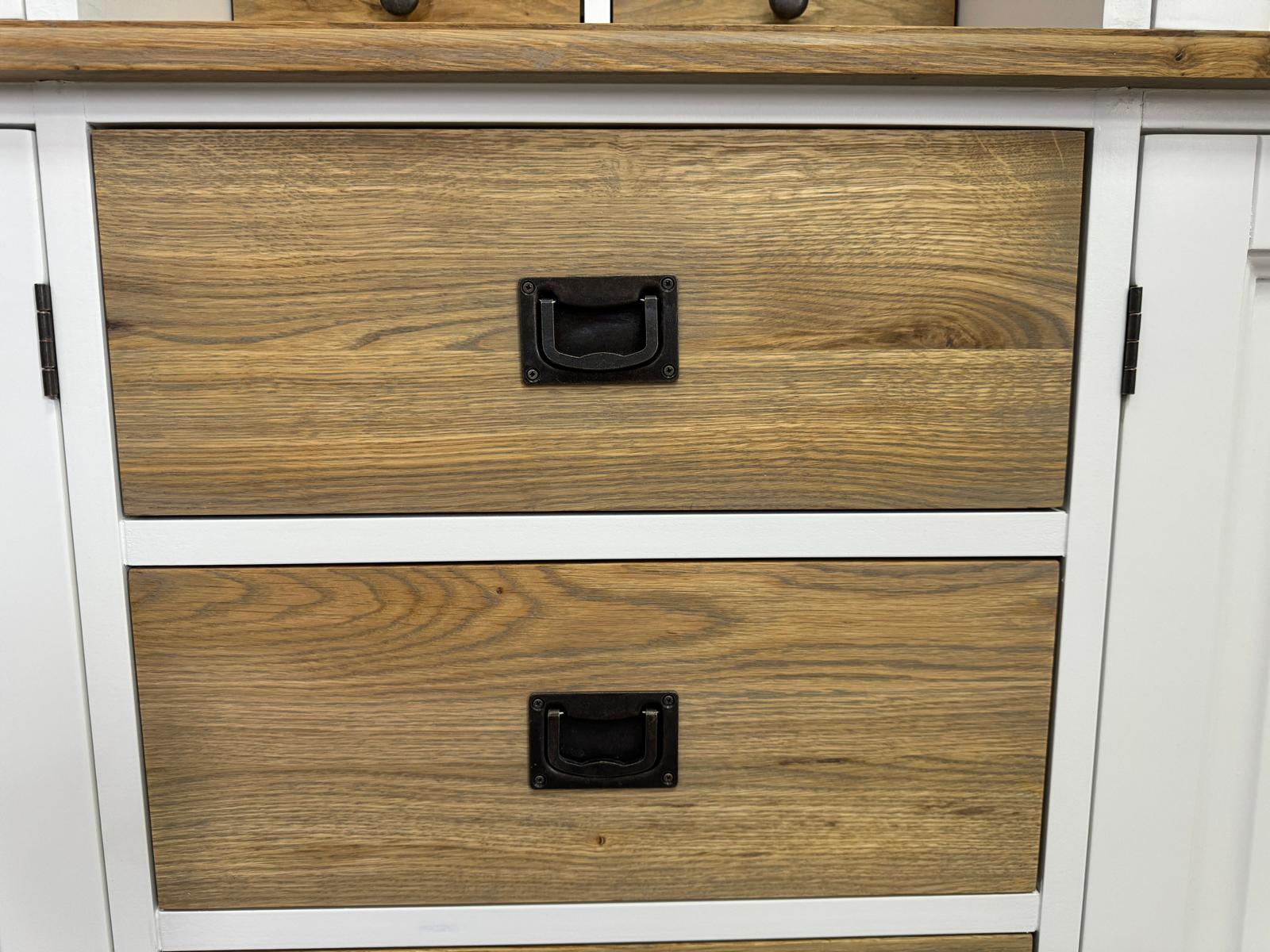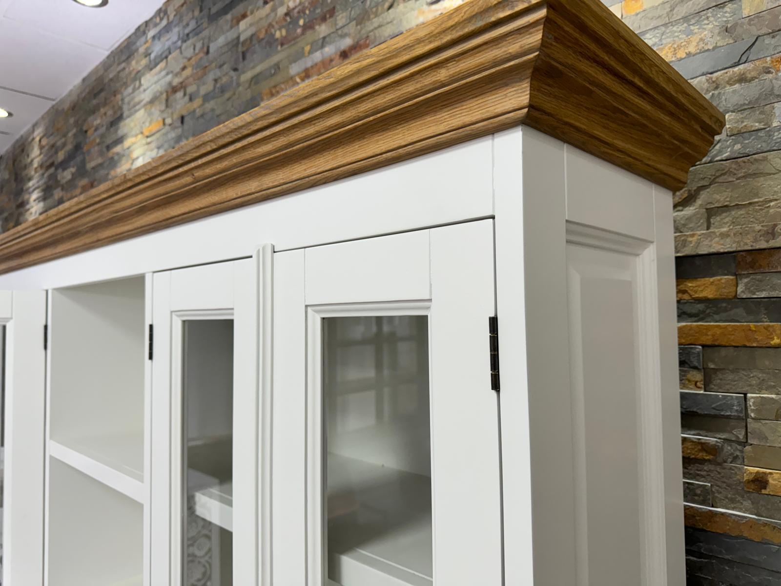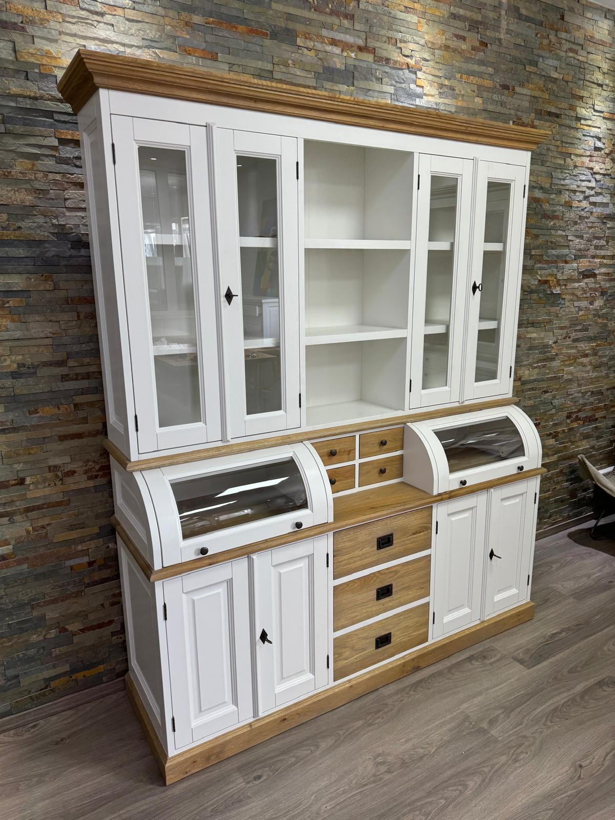Der schöne Buffet Schrank im angesagtem Landhaus-Stil ist ein hochwertiges und zeitloses Möbelstück, welches überall in Ihrem Haus einen prägenden Eindruck hinterlässt. Neben viel Stauraum im unterem Bereich, bietet Ihnen der obere Bereich mit einer Glasfront die Möglichkeit, den Landhaus-Stil durch Wohnaccessoires zu unterstreichen. Der 2-teilige Buffetschrank ist weiß, mit Eichenelementen abgesetzt. Der Buffet Schrank wird nicht nur Ihr Eigenheim in neuem Glanz erstrahlen lassen, sondern durch seine Langlebigkeit Sie auf Dauer erfreuen.