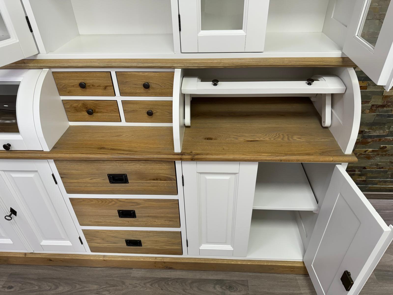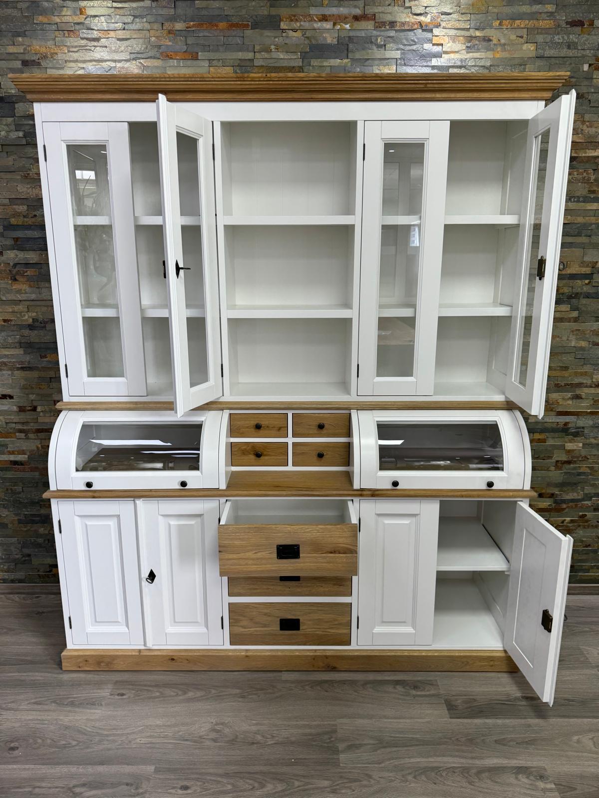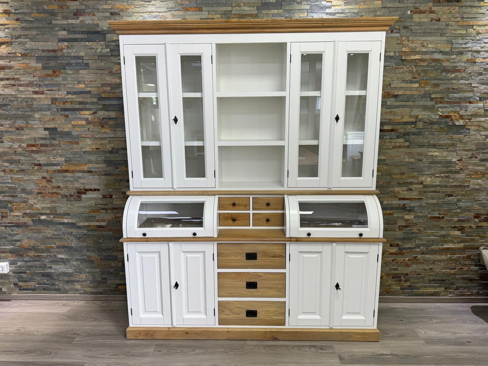 Ein schöner Buffet Schrank im Landhaus-Stil. Das 2-teilige Buffet ist ein zeitloses Möbelstück, welches überall in Ihrem Haus einen prägenden Eindruck hinterlässt. Mi viel Stauraum im unteren Bereich, bietet Ihnen der obere Bereich mit Glasfront die Möglichkeit, den Landhaus-Stil durch Wohnaccessoires zu unterstreichen. Der Schrank ist weißglänzend lackiert und mit schönen Eichenholzelementen ergänzt. Die Schubladen, der Kranz und die Leisten sind aus massivem Eichenholz. Jedes Möbelstück ist individuell gefertigt und ein schönes Unikat. Der 2-teilige Schrank wird nicht nur Ihr Eigenheim in neuem Glanz erstrahlen lassen, sondern durch seine Langlebigkeit und Anblick Sie auf Dauer erfreuen. Landhausmöbel bei wohnpalast.de Details: Material: Massivholz Farbe: weiß-eiche Zustand: Neu Stil: Landhausstil Anlieferung: 2-teilig zerlegt, wohnfertig Maße (H/B/T): 210x150x30/50 cm