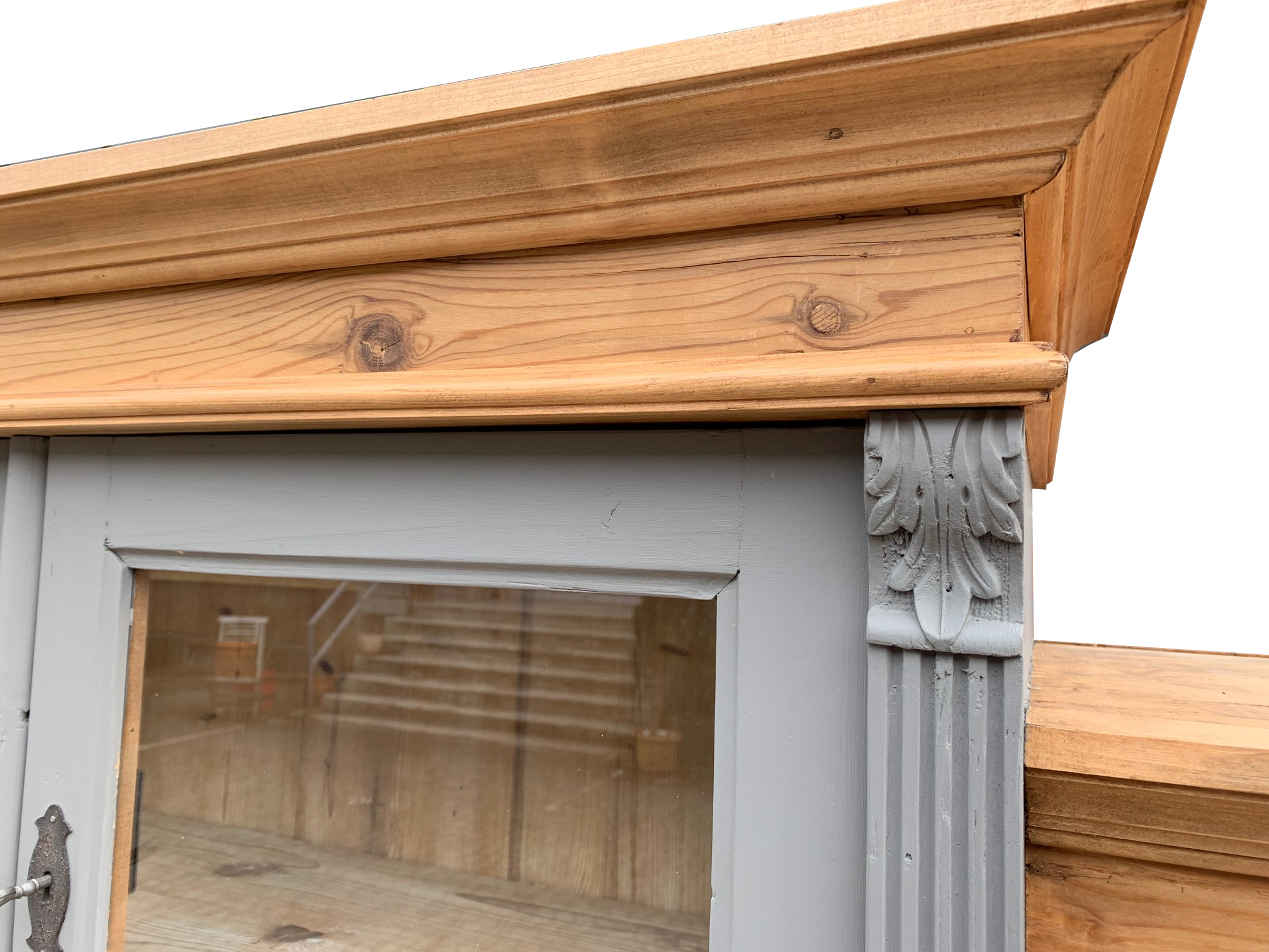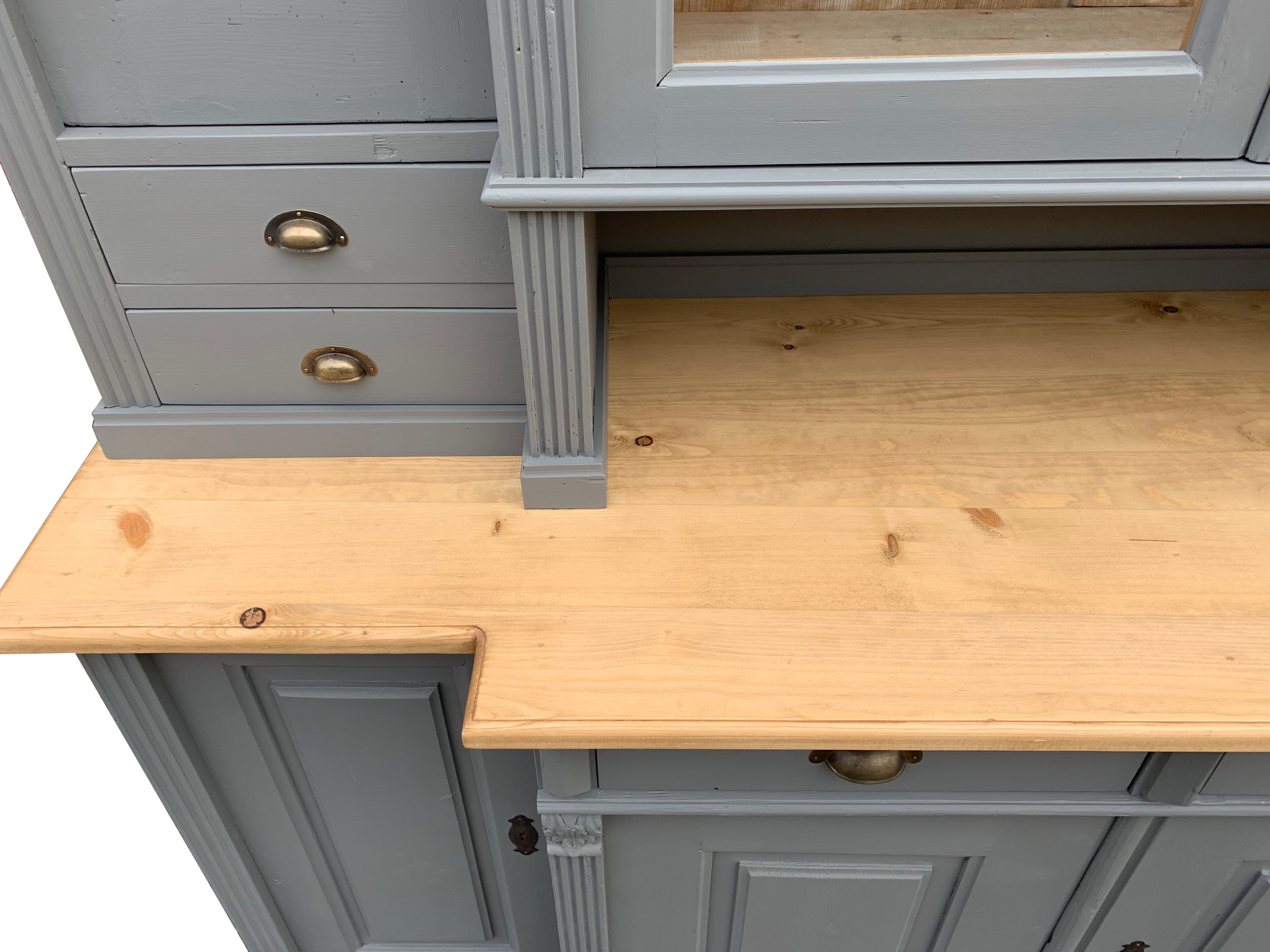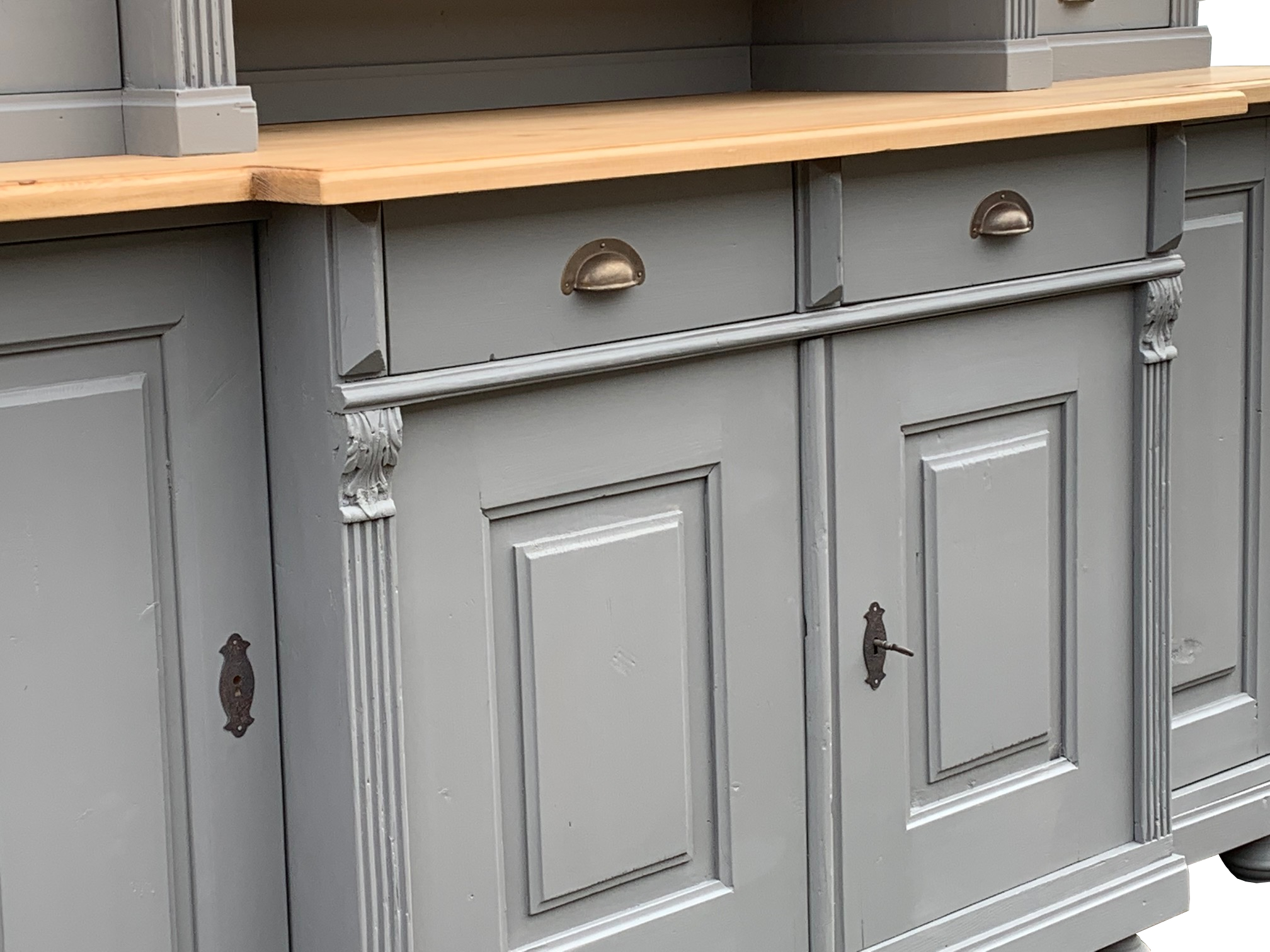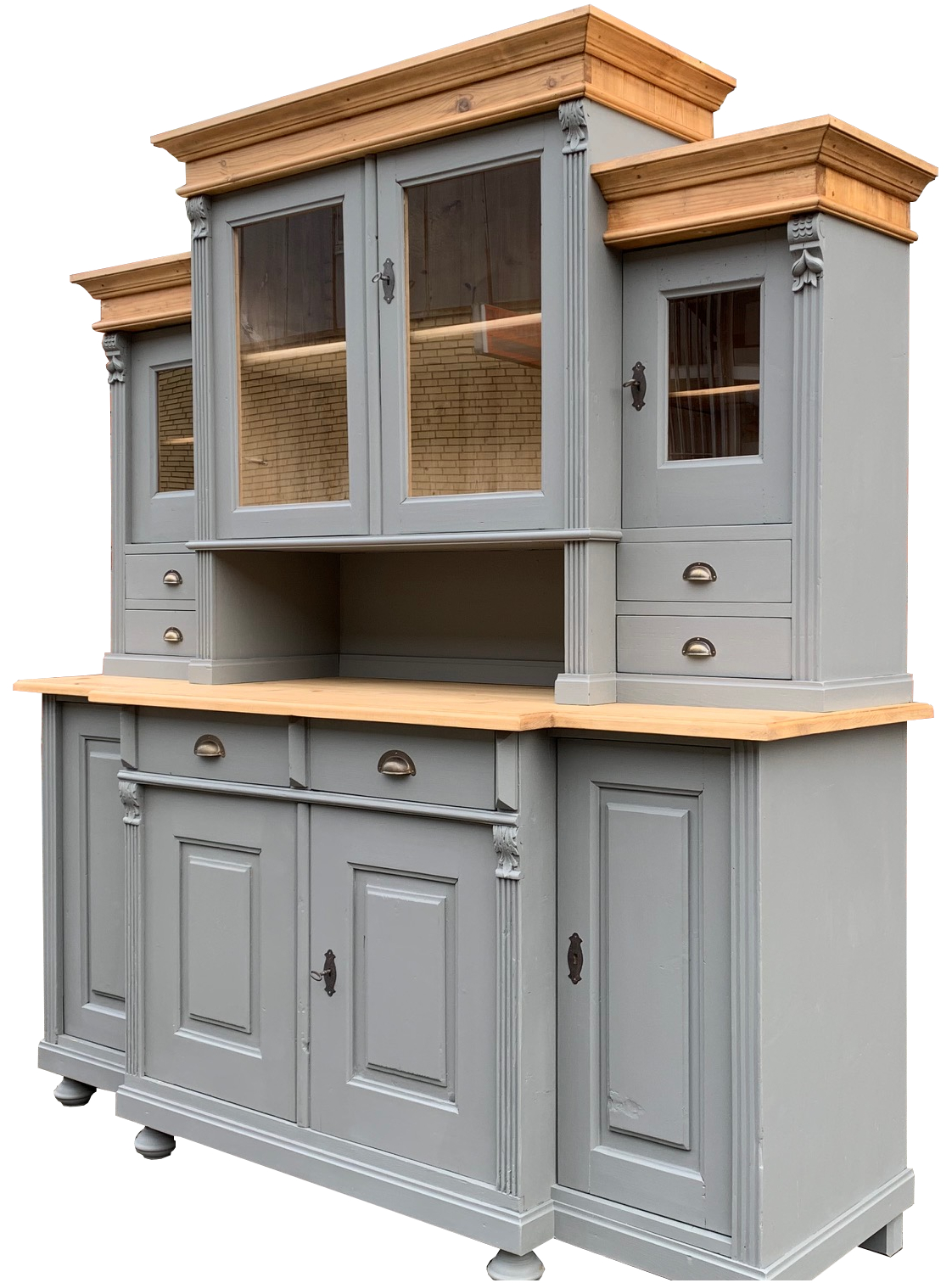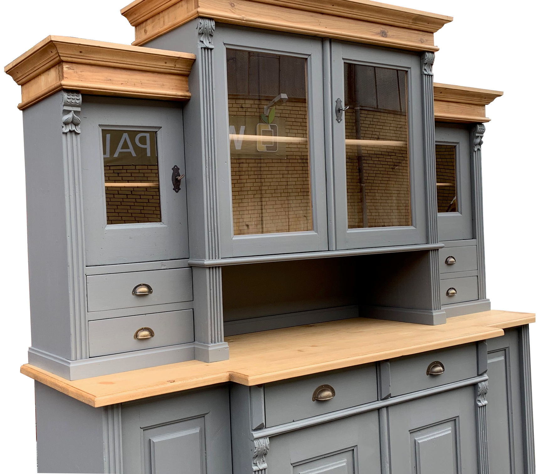 Ein schöner Buffet Schrank aus Weichholz im Landhaus Stil. Das Gründerzeit Buffet ist zweifarbig. Mit vielen Schubladen. Dieses schöne Einzelstück ist von Hand gestrichen und einer feinen Pinselstruktur. Die Arbeitsplatte ist in antikbraun abgesetzt und gewachst. Die vorhandenen Gebrauchsspuren haben einen antiken Charakter und sind bewusst gewollt. Das große zweiteilige Buffet lässt sich perfekt mit vielen anderen Massivholzmöbeln kombinieren. antike Weichholzmöbel, Buffet Schränke, Kommode, antike Schränke online bestellen und direkt nach Hause liefern lassen. Abmessungen (H/B/T): ca. 212/185/60 Beschreibung Buffet Weichholz Massivholz Jedes Möbelstück ein Unikat handgefertigt fertig montiert 2-teilig