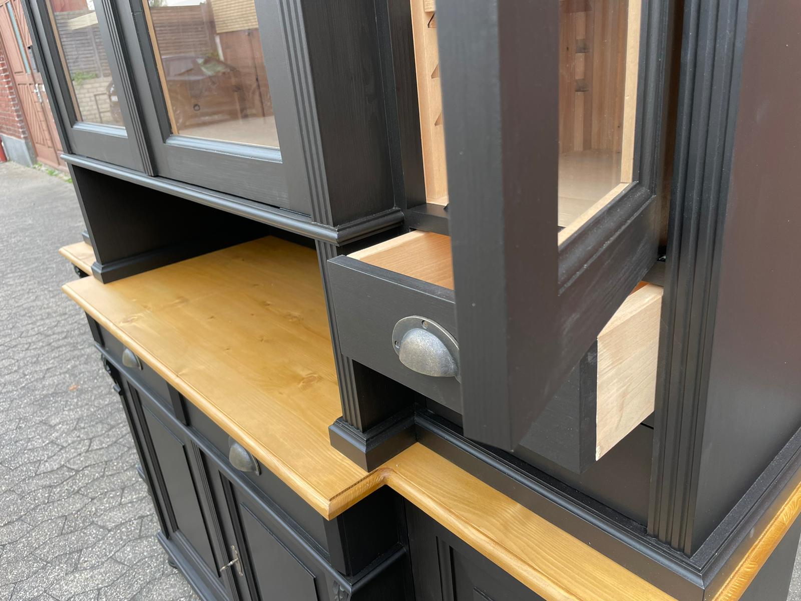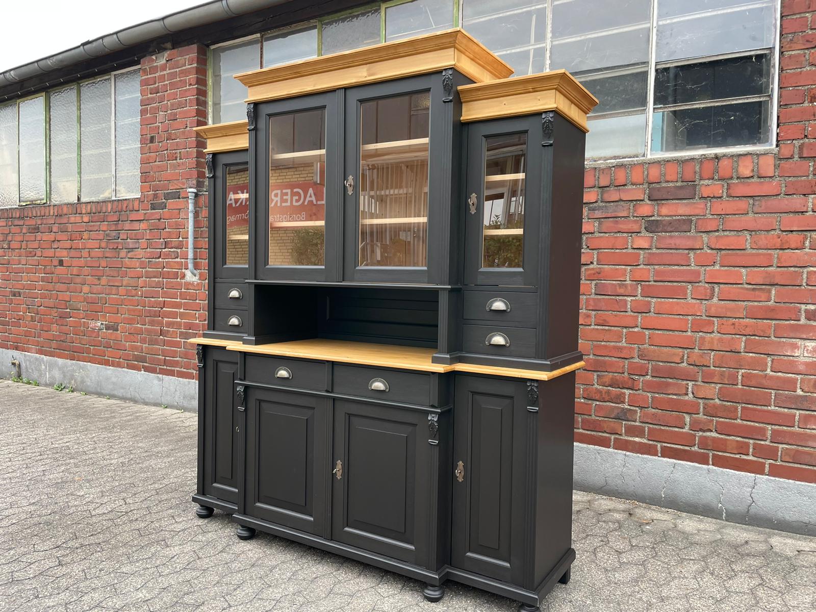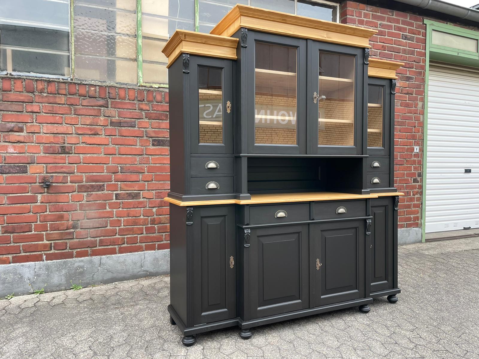 Ein schöner Buffet Schrank aus Weichholz im Landhaus Stil. Das Gründerzeit Buffet ist zweifarbig. Mit vielen Schubladen. Dieses schöne Einzelstück ist von Hand gestrichen und einer feinen Pinselstruktur. Die Arbeitsplatte ist in antikbraun abgesetzt und gewachst. Die vorhandenen Gebrauchsspuren haben einen antiken Charakter und sind bewusst gewollt. Das große zweiteilige Buffet lässt sich perfekt mit vielen anderen Massivholzmöbeln kombinieren. antike Weichholzmöbel, Buffet Schränke, Kommode, antike Schränke online bestellen und direkt nach Hause liefern lassen. Abmessungen (H/B/T): ca. 212/185/60 Beschreibung Buffet Weichholz Massivholz Jedes Möbelstück ein Unikat handgefertigt fertig montiert 2-teilig