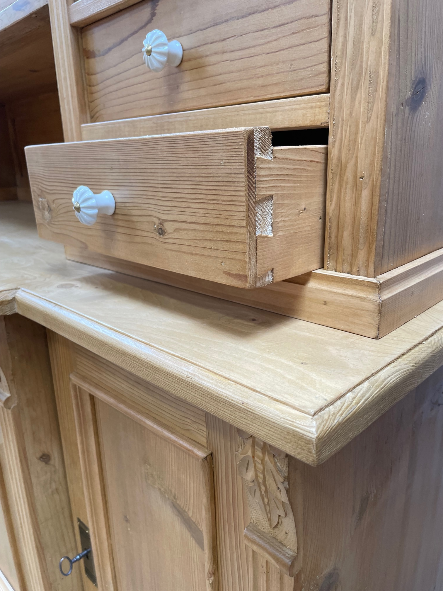 Schönes Buffet aus Weichholz mit großen Schubladen und schönen alten Beschlägen. Das Buffet wurde mit Antikwachs behandelt und aufpoliert. Der Innenausbau beinhaltet stabile Regalböden. Es ist in unserer Fachwerkstatt restauriert worden und befindet sich in einem guten wohnfertigen Zustand. Das Buffet im angesagten Landhaus-Stil ist ein hochwertiges, zeitloses Möbelstück, welches überall in Ihrem Haus einen prägenden Eindruck hinterlässt und eine gute Figur macht. Neben viel Stauraum in den Schubladen, lässt der obere Stauraum viel Platz für Ideen und dekorative Accessoires. Diese Weichholz Buffets sind alle etwas unterschiedlich in den Abmessungen, können etwas abweichen und die Applikationen können abweichen. Abmessungen ca.: H/B/T- 212/189/53 Weichholz Buffet, von Hand bearbeitet gewachst und aufpoliert fertig montiert 2-teilig