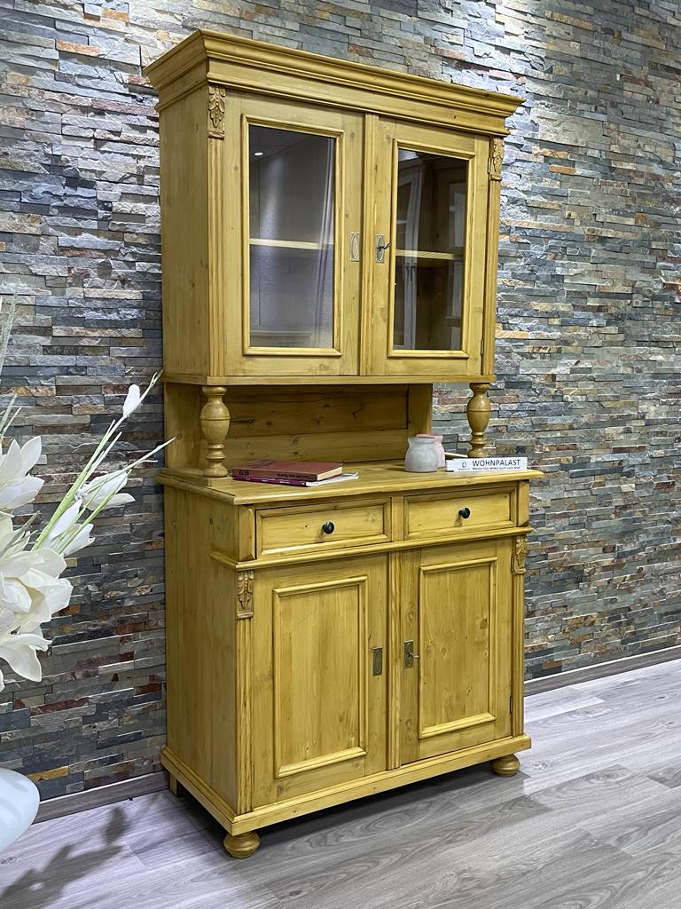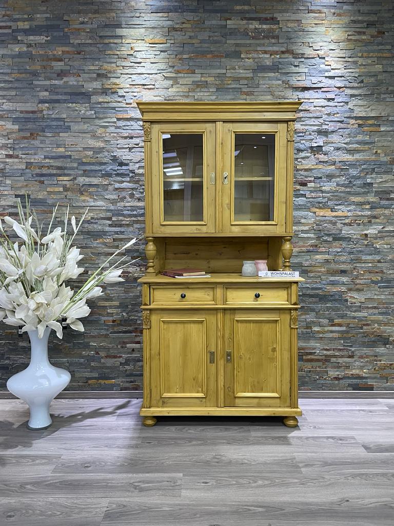 Ein schönes Gründerzeit Weichholz Buffet. Mit Schubladen und Regalböden. Die vorhandenen Gebrauchsspuren haben einen antiken Charakter und sind bewusst gewollt. Das Antikwachs veredelt das Holz und die zusätzliche Politur gibt dem Buffet einen seidenmatten Glanz. Das Weichholz Buffet im angesagten Landhausstil ist ein hochwertiges und zeitloses Möbelstück, welches überall in Ihrem Haus einen prägenden Eindruck hinterlässt. Abmessungen: Höhe: 205 cm, Breite: 158 cm, Tiefe: 56 (36) cm. Weichholz Buffet gewachst und aufpoliert mit Innenausbau fertig montiert 2-teilig Kredenz Weichholzmöbel