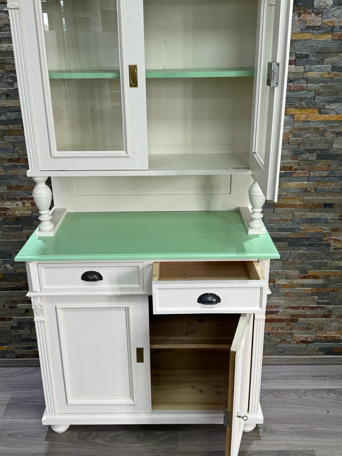 Ein Landhaus Buffet Schrank aus Weichholz in´weiß lackiert, mit mintgrünen Akzenten. Der Innenausbau beinhaltet stabile Regalböden. Das Buffet im angesagten Landhaus-Stil ist ein hochwertiges, zeitloses Möbelstück, welches überall in Ihrem Haus einen prägenden Eindruck hinterlässt. Neben viel Stauraum in den Schubladen, lässt der obere Stauraum viel Platz für Ideen und dekorative Accessoires.