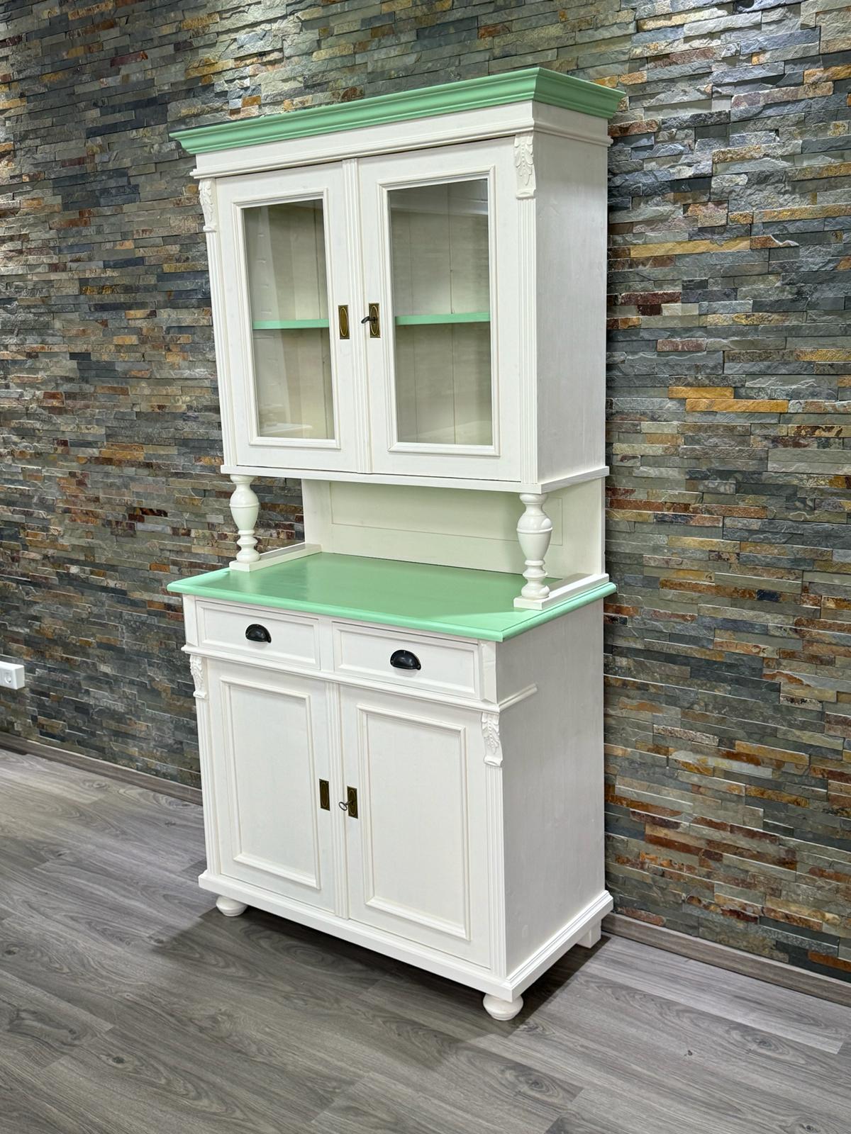 Ein schönes Gründerzeit Weichholz Buffet. Mit Schubladen und Regalböden. Die vorhandenen Gebrauchsspuren haben einen antiken Charakter und sind bewusst gewollt. Das Antikwachs veredelt das Holz und die zusätzliche Politur gibt dem Buffet einen seidenmatten Glanz. Das Weichholz Buffet im angesagten Landhausstil ist ein hochwertiges und zeitloses Möbelstück, welches überall in Ihrem Haus einen prägenden Eindruck hinterlässt. Abmessungen: Höhe: 205 cm, Breite: 158 cm, Tiefe: 56 (36) cm. Weichholz Buffet gewachst und aufpoliert mit Innenausbau fertig montiert 2-teilig Kredenz Weichholzmöbel