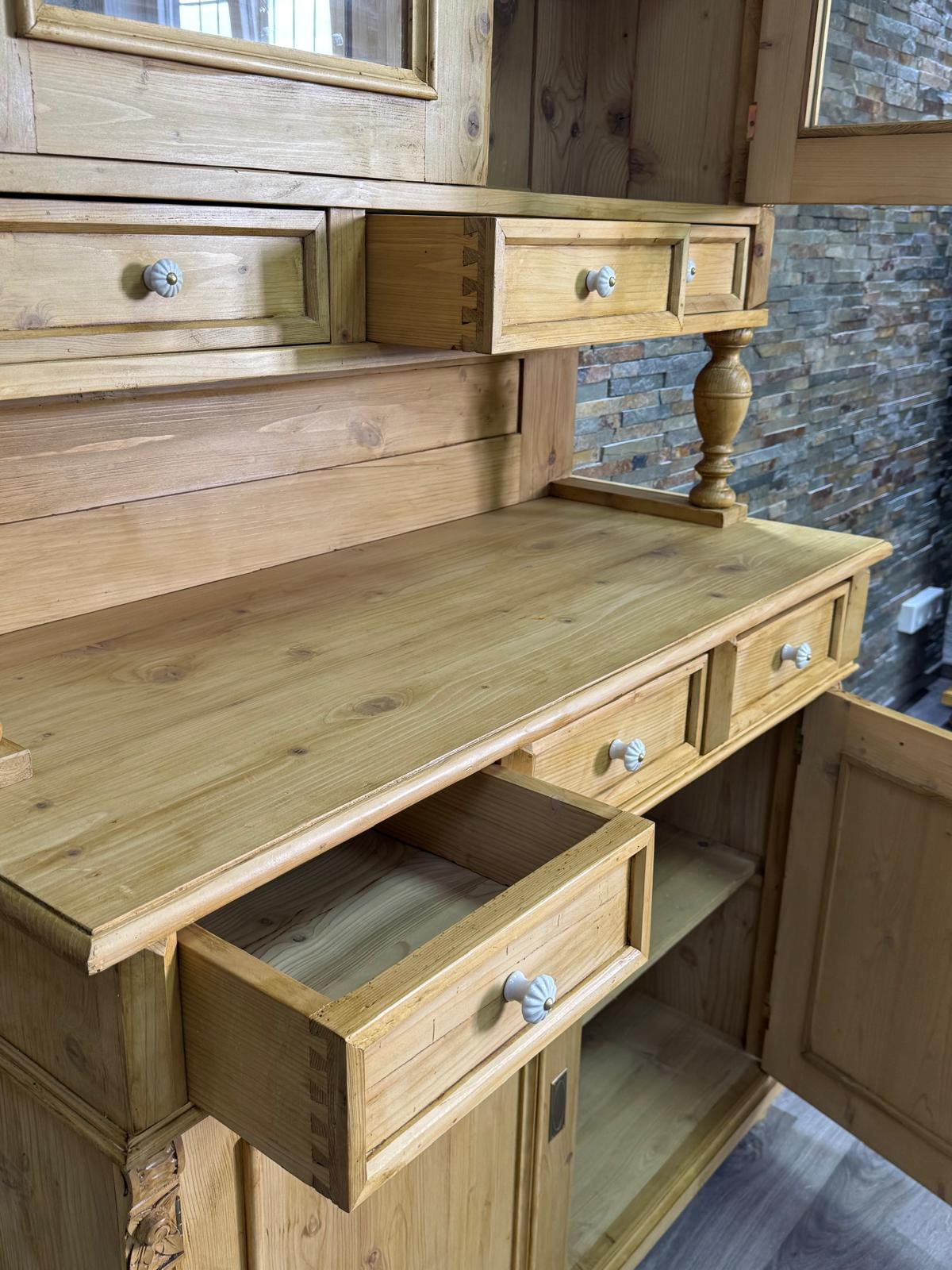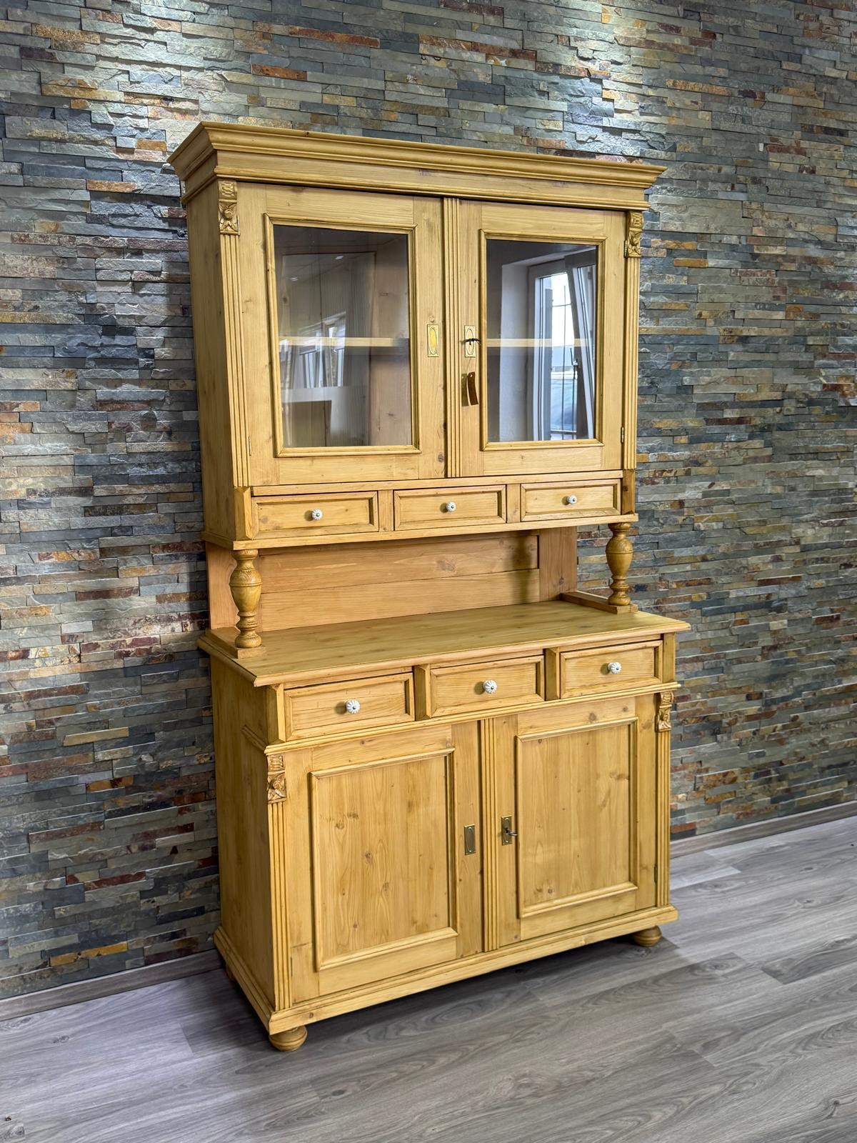 Ein schönes Gründerzeit Weichholz Buffet. Mit Schubladen und Regalböden. Die vorhandenen Gebrauchsspuren haben einen antiken Charakter und sind bewusst gewollt. Das Antikwachs veredelt das Holz und die zusätzliche Politur gibt dem Buffet einen seidenmatten Glanz. Das Weichholz Buffet im angesagten Landhausstil ist ein hochwertiges und zeitloses Möbelstück, welches überall in Ihrem Haus einen prägenden Eindruck hinterlässt. Abmessungen: Höhe: 205 cm, Breite: 158 cm, Tiefe: 56 (36) cm. Weichholz Buffet gewachst und aufpoliert mit Innenausbau fertig montiert 2-teilig Kredenz Weichholzmöbel