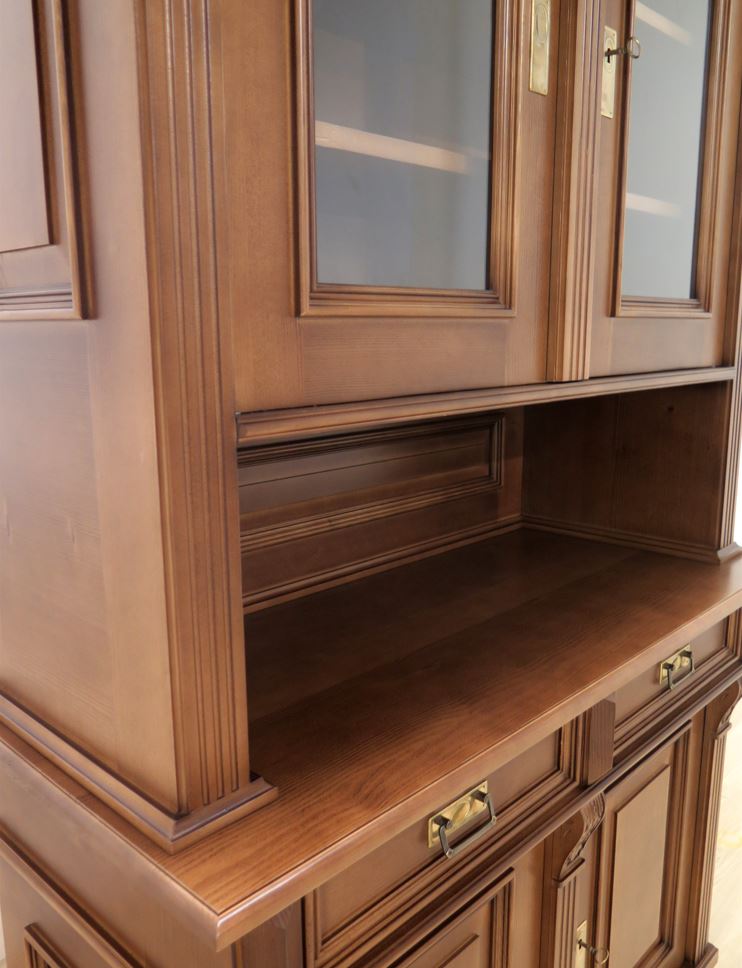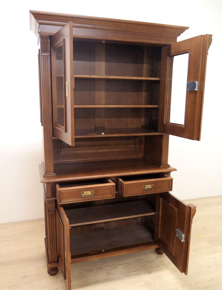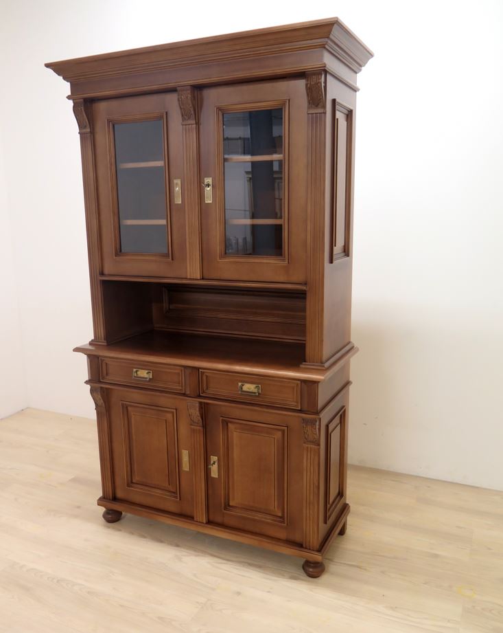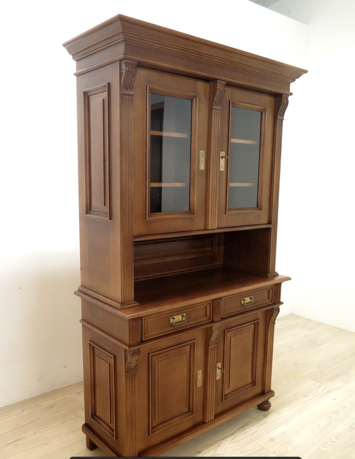 Die Oberfläche wurde sorgfältig mit Walnussbeize und Lack bearbeitet, wodurch der Schrank eine edle, dunkle Ausstrahlung erhält. Innen überzeugt er durch stabile, verstellbare Regalböden und praktischen Stauraum für Geschirr, Gläser oder dekorative Accessoires.