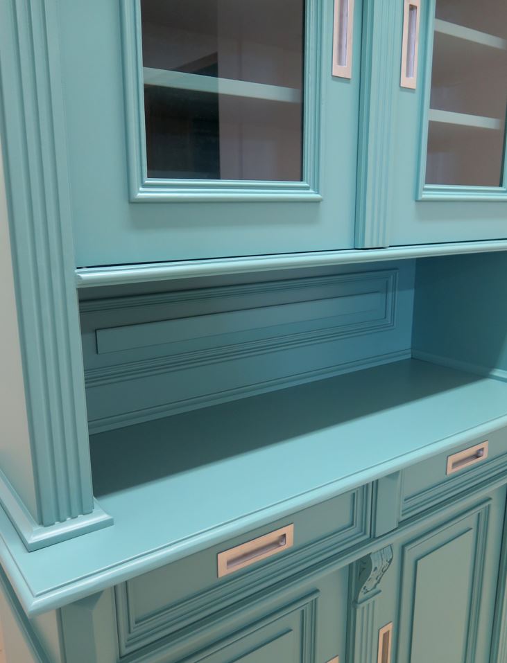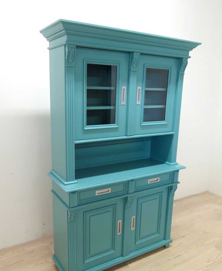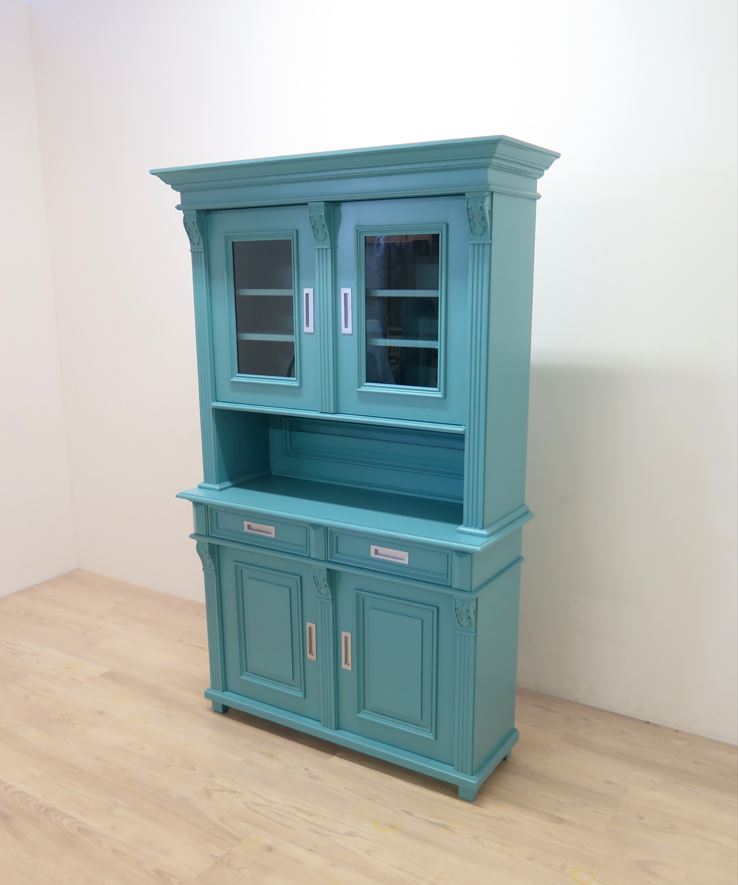 Die Oberfläche wurde sorgfältig mit grünem Lack bearbeitet, wodurch der Schrank eine edle, Ausstrahlung erhält. Innen überzeugt er durch stabile, verstellbare Regalböden und praktischen Stauraum für Geschirr, Gläser oder dekorative Accessoires.