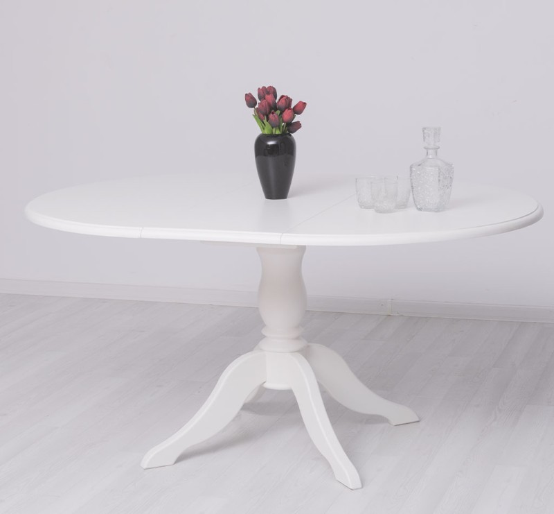 Der verlängerbare runde Tisch ist durch einfaches Öffnen der Arbeitsplatte in beide Richtungen und Anbringen der Verlängerung ein äußerst bequemer Esstisch mit großzügigen Abmessungen.
