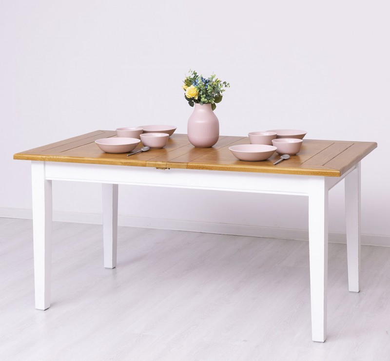 Dieser erweiterbare Küchentisch kann von 160 cm auf 220 cm verlängert werden. Die Verlängerung wird unter der Arbeitsplatte montiert. Durch einfaches Verschieben der Arbeitsplattenöffnung in beide Richtungen und Zusammenklappen der Verlängerung erhalten Sie einen äußerst bequemen Esstisch mit großzügigen Abmessungen.
