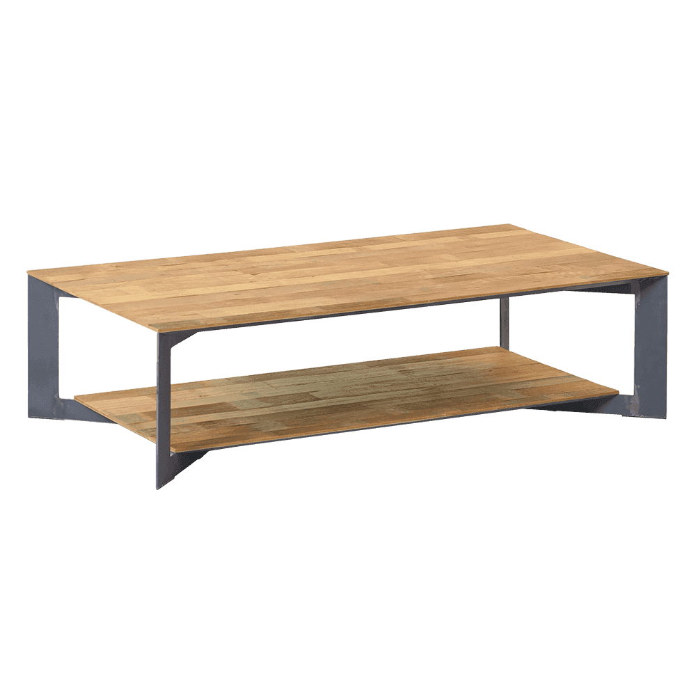 Der Pandora Couchtisch 135 cm ist ein modernes und zeitgemäßes Möbelstück, das aus gebürstetem und recyceltem Teakholz in Kombination mit Metall besteht. Dieser Beistelltisch enthält eine untere Ablage, die sehr praktisch ist, um Dinge darauf zu stellen. Durch diese Materialkombination passt dieser Beistelltisch gut in jedes industrielle Interieur.
