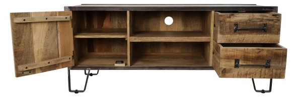 Ein tolles Lowboard aus Mangoholz und Eisen im Industrie-Look. Außen ist das Eisen mit dem natürlichem Charme des Mangoholzes sichtbar. Die Front ist im Vintage-Look gehalten. Links ist eine Tür mit dahinterliegendem Einlegenboden, in der Mitte 2 offene Fächer für Ihren Blu-Ray Player, Ihre Skybox oder die Spielkonsole und rechts befinden sich 2 Schubladen.
