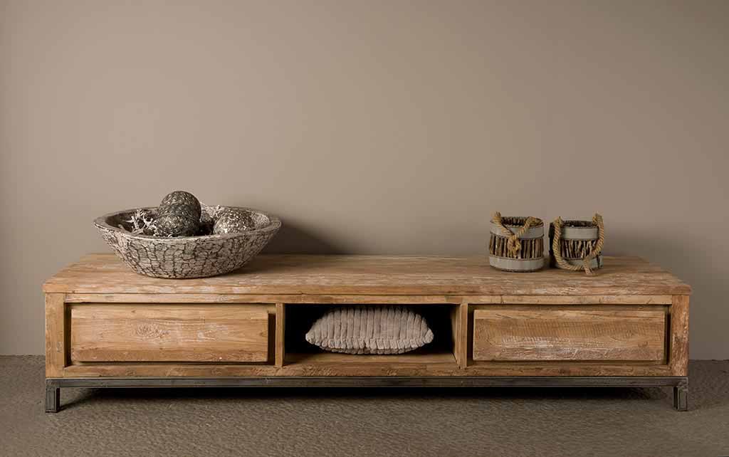 Der Venedig TV-Schrank wird aus recyceltem Teakholz hergestellt. Durch die Kombination von Farbe und Material fügt sich dieses TV-Möbel gut in jedes industrielle Interieur ein. Der Schrank hat je nach Konfiguration bis zu zwei Schubladen und ein bis maximal zwei offene Fächer, Sehr praktisch, um Ihre Sachen zu verstauen.