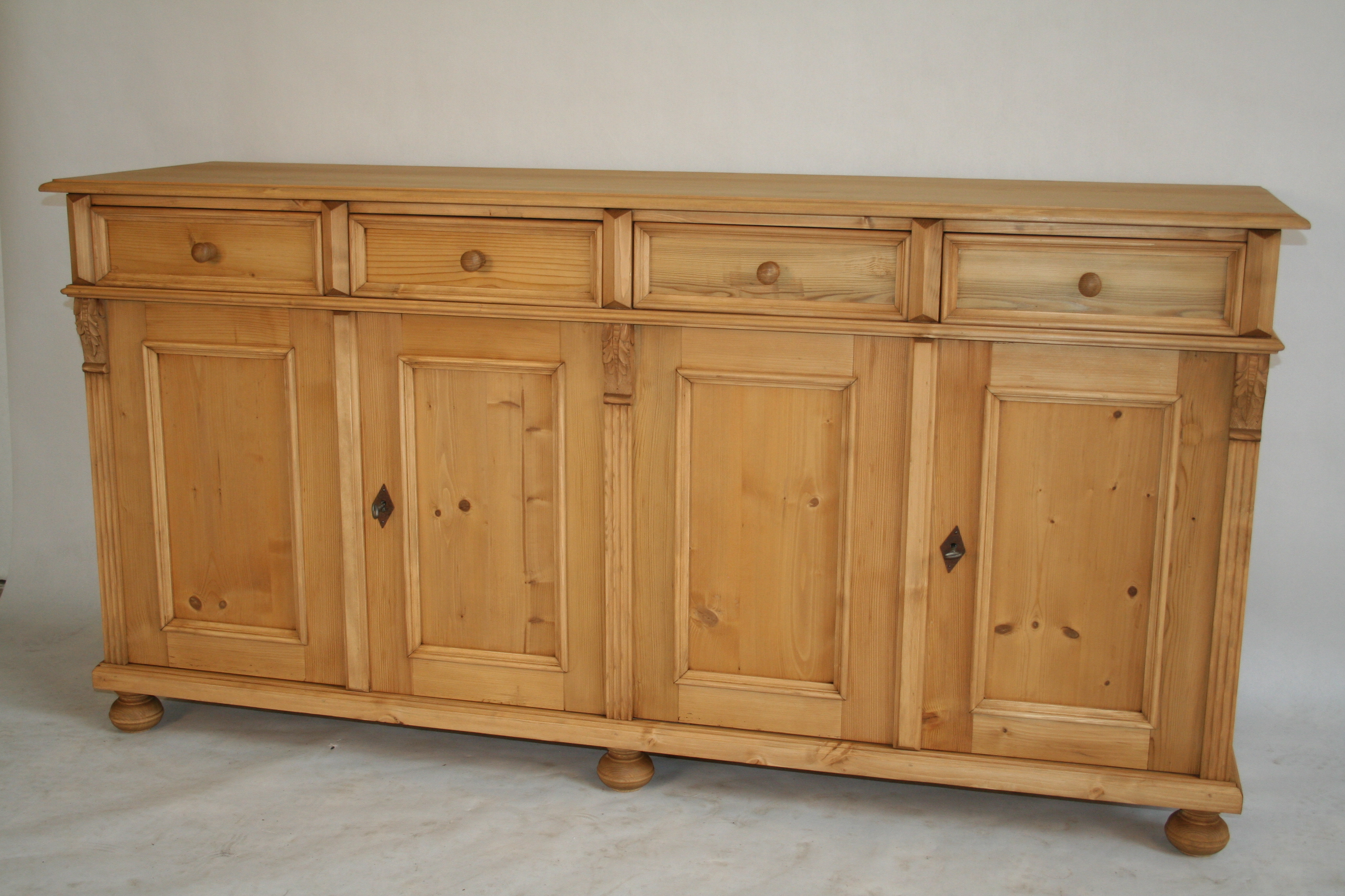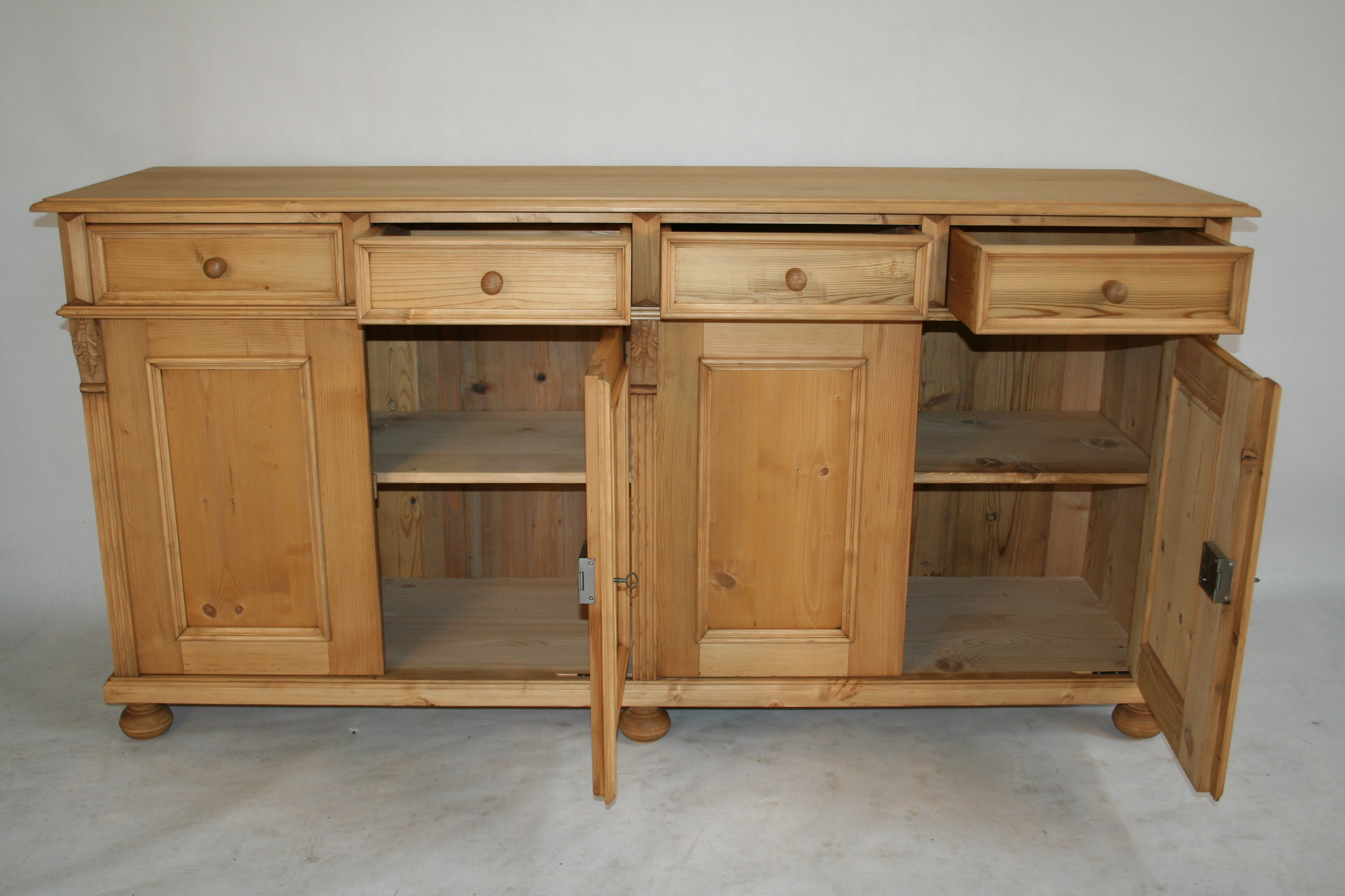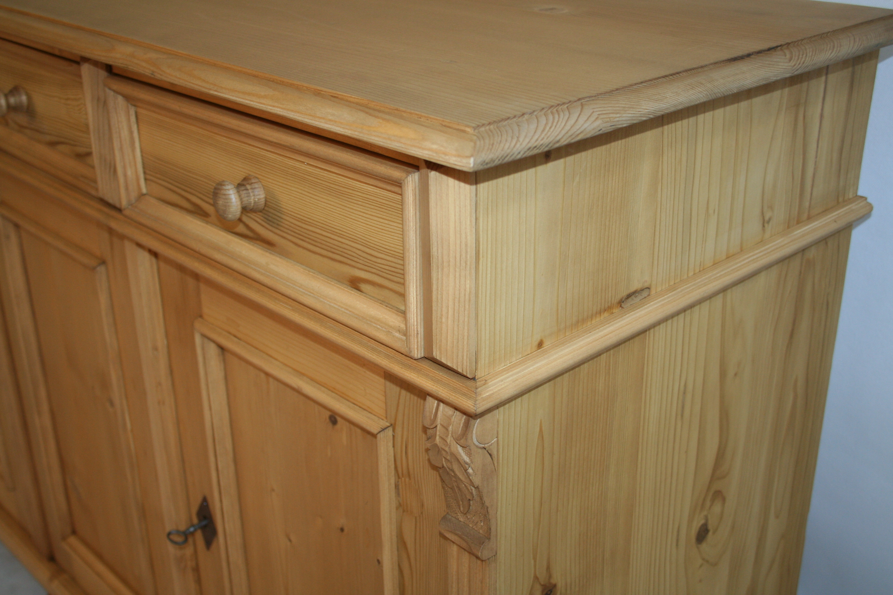 Eine schöne Landhaus Weichholz Anrichte im Jugendstil. Mit drei großen Schubladen. Innenseitig haben Sie eine intelligente Raumaufteilung mit Einlegeböden. Die Gebrauchsspuren geben einen antiken Charakter und sind bewusst gewollt. Sie haben die Wahl zwischen einer geölten oder gewachsten Oberfläche. Diese treffen Sie rechts neben der Bildauswahl. Die Kommdoe wurde nach alten Vorlagen aus Altholz neu gebaut. Abmessungen(H/B/T): 90/158/50 cm