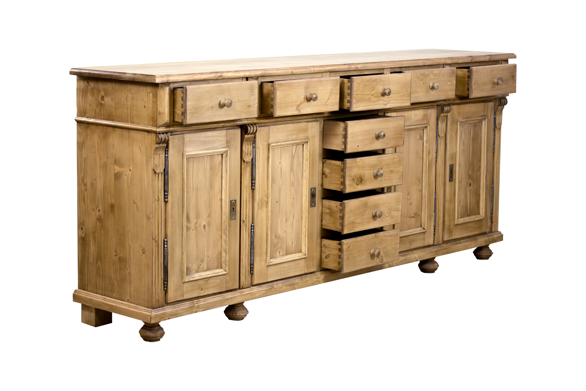 Eine schöne Massivholz Anrichte mit 4 Türen und 9 Schubladen. Der Antikwachs veredelt das Holz und die zusätzliche Politur gibt der Kommode einen leichten seidenmatten Glanz. Dieses Sideboard im angesagtem Landhausstil ist ein hochwertiges und zeitloses Möbelstück, welches überall in Ihrem Haus einen prägenden Eindruck hinterlässt und eine gute Figur macht.
