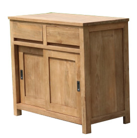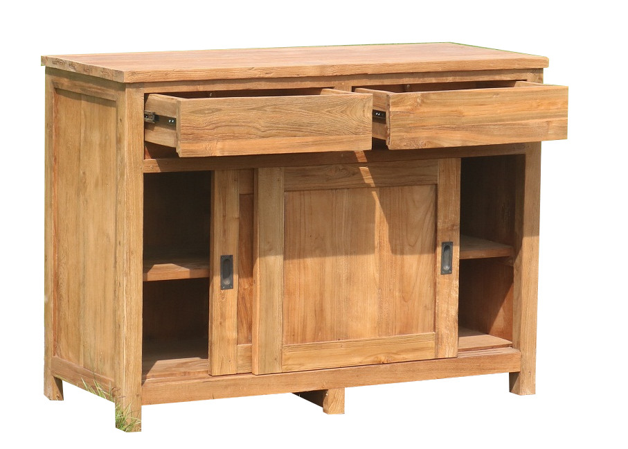 Eine massive Kommode aus Teakholz mit Schiebetüren und großen Schubladen. Durch die intelligente Raumteilung mit Einlegeböden bietet die Kommode viel Platz für ihr Hab und Gut. Die Kommode wurde aus recycelten Teakholz hergestellt.