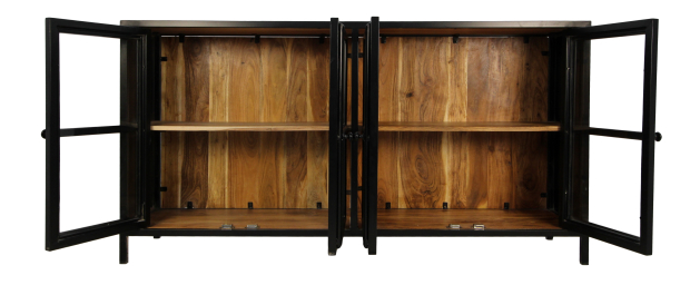 Eine tolle Kommode aus Akazienholz mit schönen Eisenelementen und Glastüren. Außen ist das naturbelassene Akazienholz sichtbar,welches durch einen massivem Metallrahmen umrandet ist. Die Front ist in schwarz gehalten und mit sehr schönen Glastüren versehen. Innen gibt es einen massivem Einlegeboden und ist im Gesamten ebenfalls in natur gehalten. Geschlossen werden die mit einem Magnetverschluss.