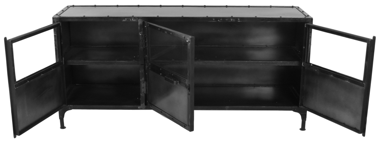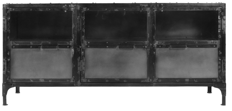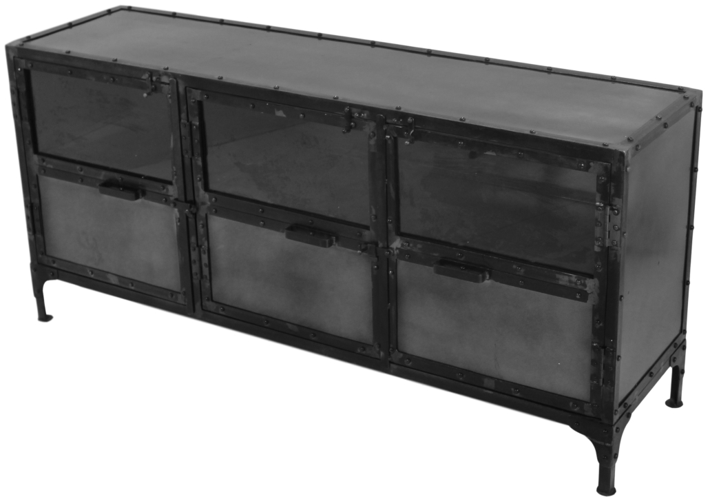 Eine tolle Kommode aus Metall und Glastüren in Industrie-Look. Außen ist das schwarze Eisen mit der Glasfront sichtbar. Die Front ist in schwarz gehalten und mit sehr schönen Glastüren versehen. Innen gibt es einen massivem Einlegeboden und ist im Gesamten ebenfalls in schwarz gehalten. Geschlossen werden die Türen mit einem Magnetverschluss.